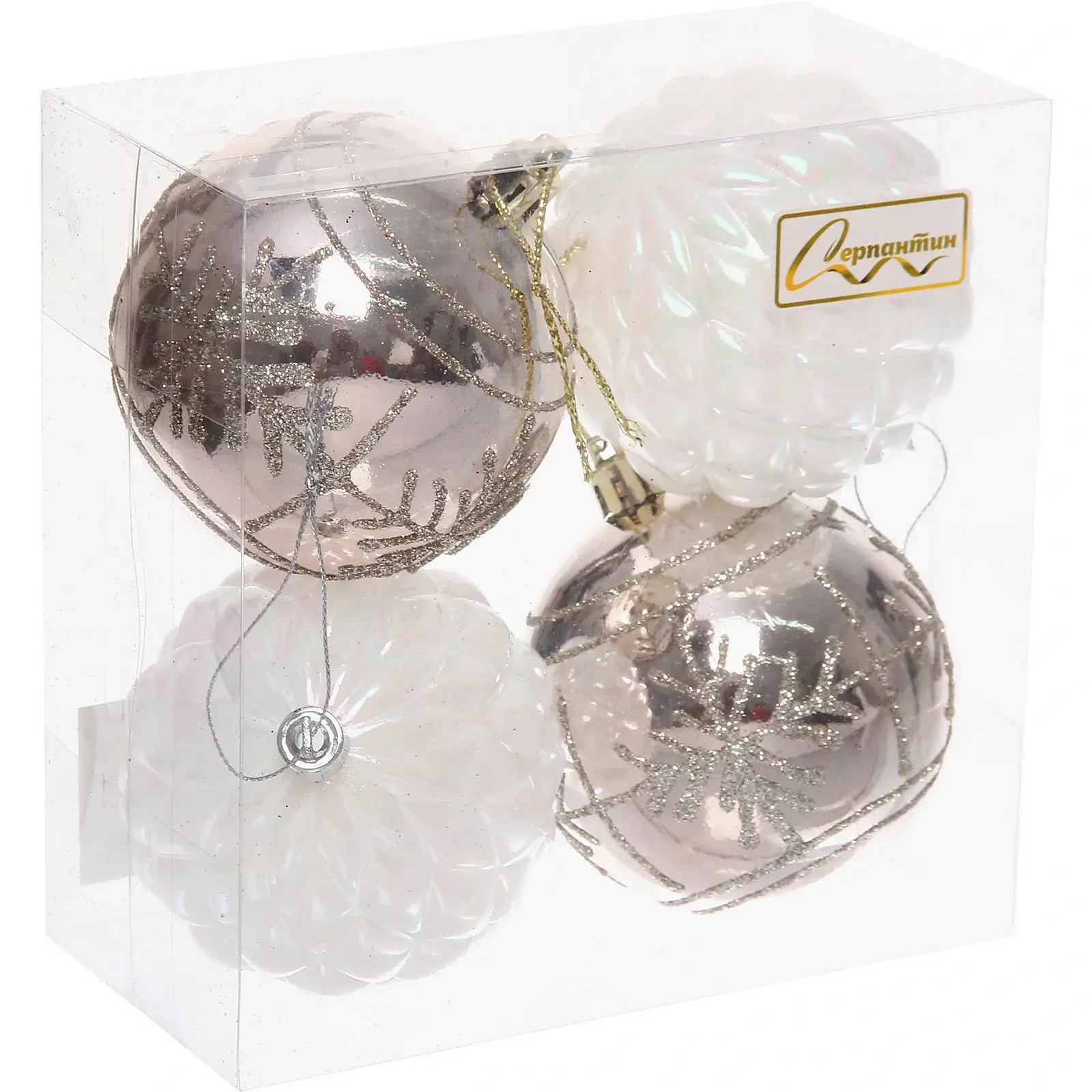 Набор из 4 стильных елочных шаров 'Метелица' станет идеальным украшением вашей новогодней елки. Классическая цветовая гамма в оттенках белого и шампань органично впишется в любой интерьер и создаст уютную праздничную атмосферу.
