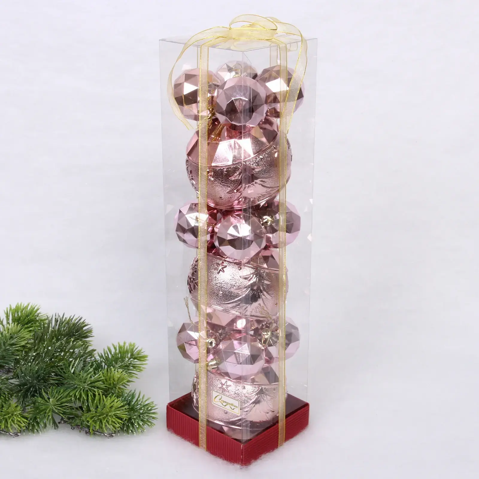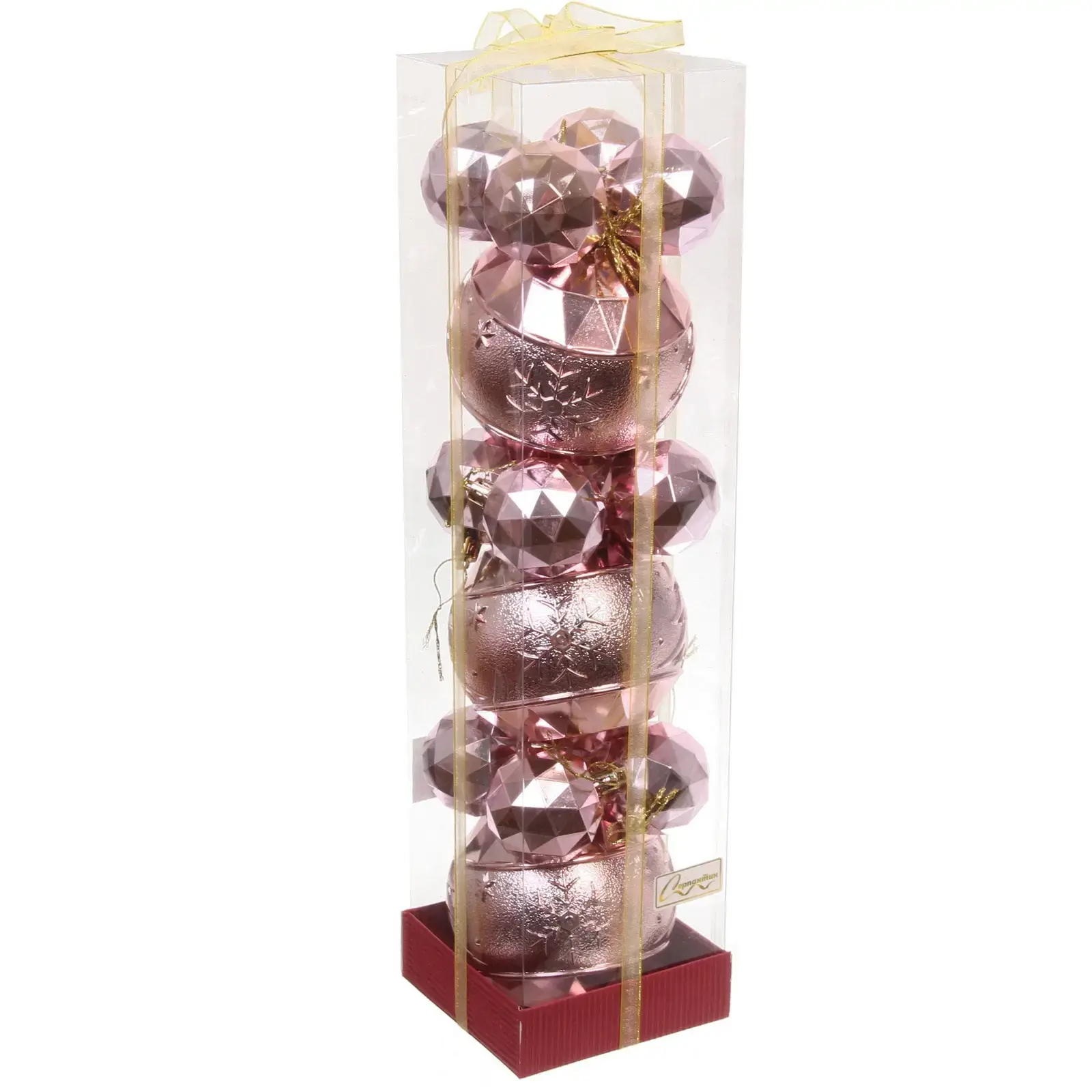 Размеры шаров варьируются: крупные шары имеют диаметр 10 см, а маленькие — 5 см. Все шары выполнены в розовом цвете с золотистыми и серебристыми узорами, что делает их универсальными для любого стиля оформления. Упаковка из прозрачного пластика позволяет увидеть содержимое и защищает шары от повреждений. Набор «Miracle» — это идеальный выбор для создания незабываемого новогоднего настроения!