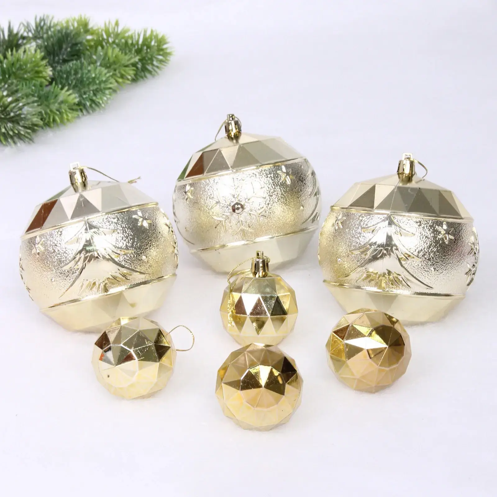 Набор состоит из 15 шаров, включая 8 крупных шаров диаметром 10 см и 7 мелких шаров диаметром 5 см. Шары выполнены из прочного пластика, что обеспечивает их долговечность и устойчивость к повреждениям. Они легко подвешиваются благодаря верхним петлям, что делает процесс декорирования простым и приятным. Этот набор идеально подходит для семейных праздников, корпоративов и других торжеств.