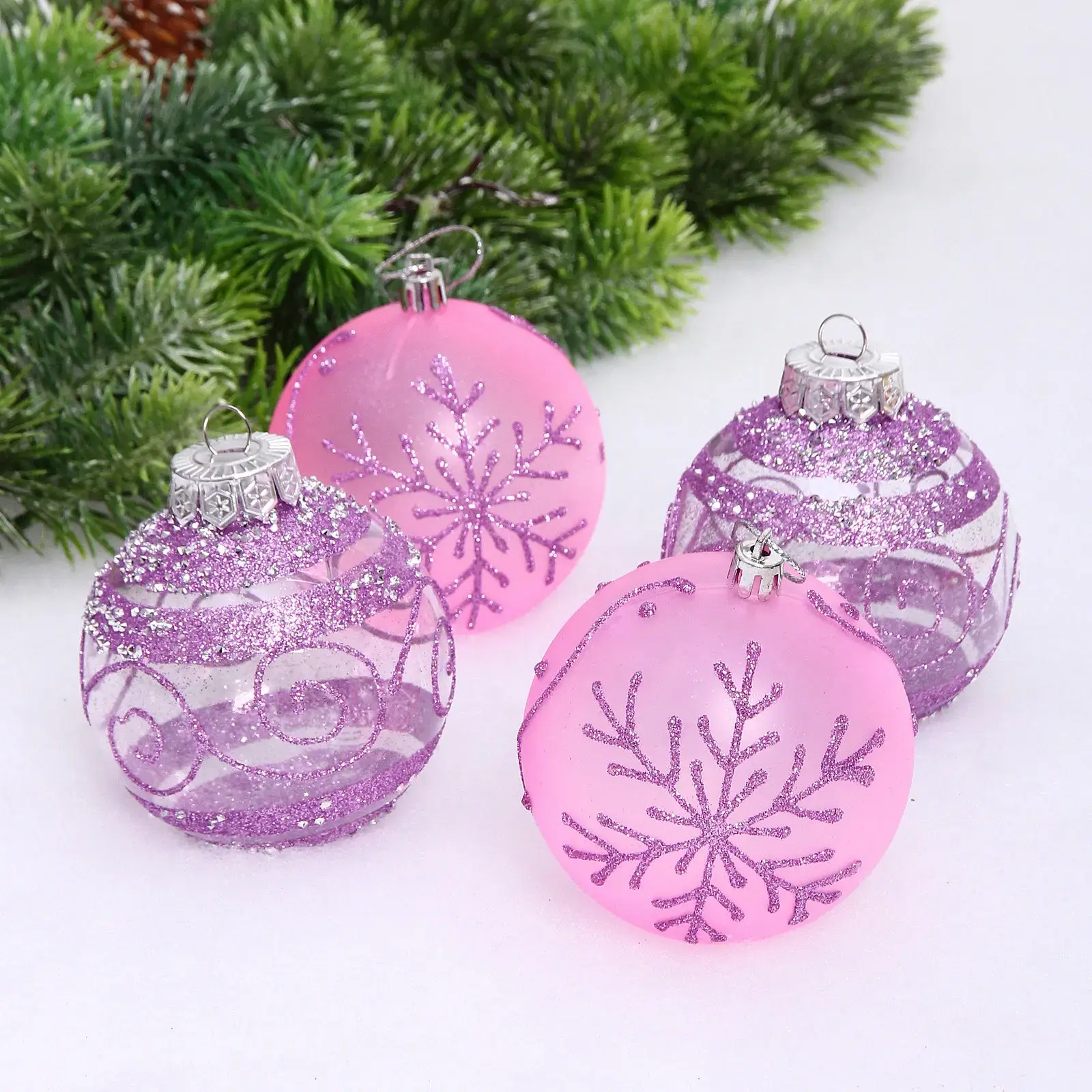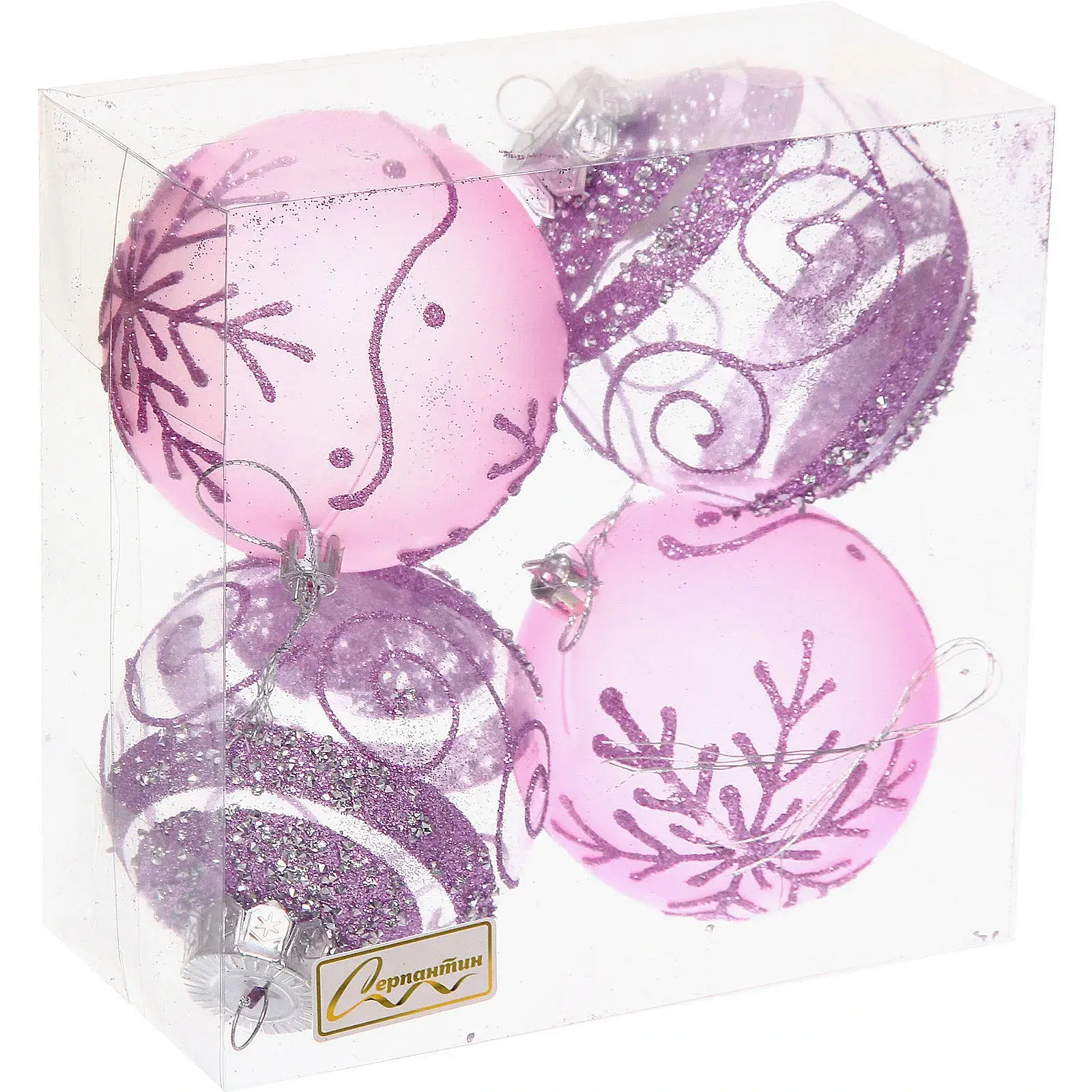 Шары диаметром 8 см выполнены из прочного пластика и украшены элегантными узорами в розовых и сиреневых тонах. Некоторые элементы имеют блестящее покрытие, создающее эффект мерцания при попадании света.