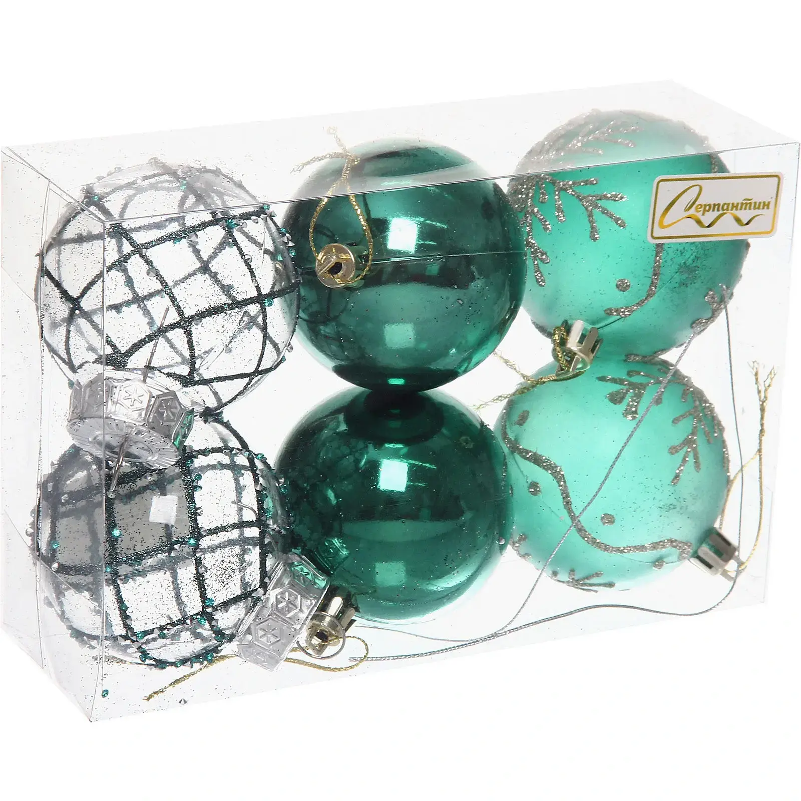 Все шары изготовлены из прочного пластика, который не бьется и сохраняет блеск долгое время. В набор входят 6 шаров двух цветов (4 голубых и 2 изумрудных), украшенных изящными серебристыми узорами.