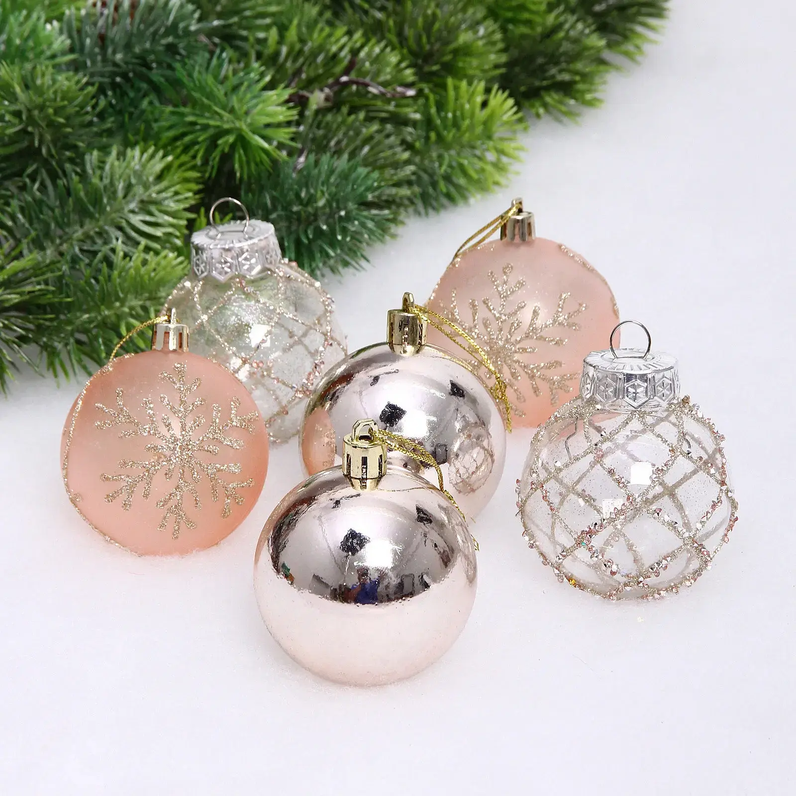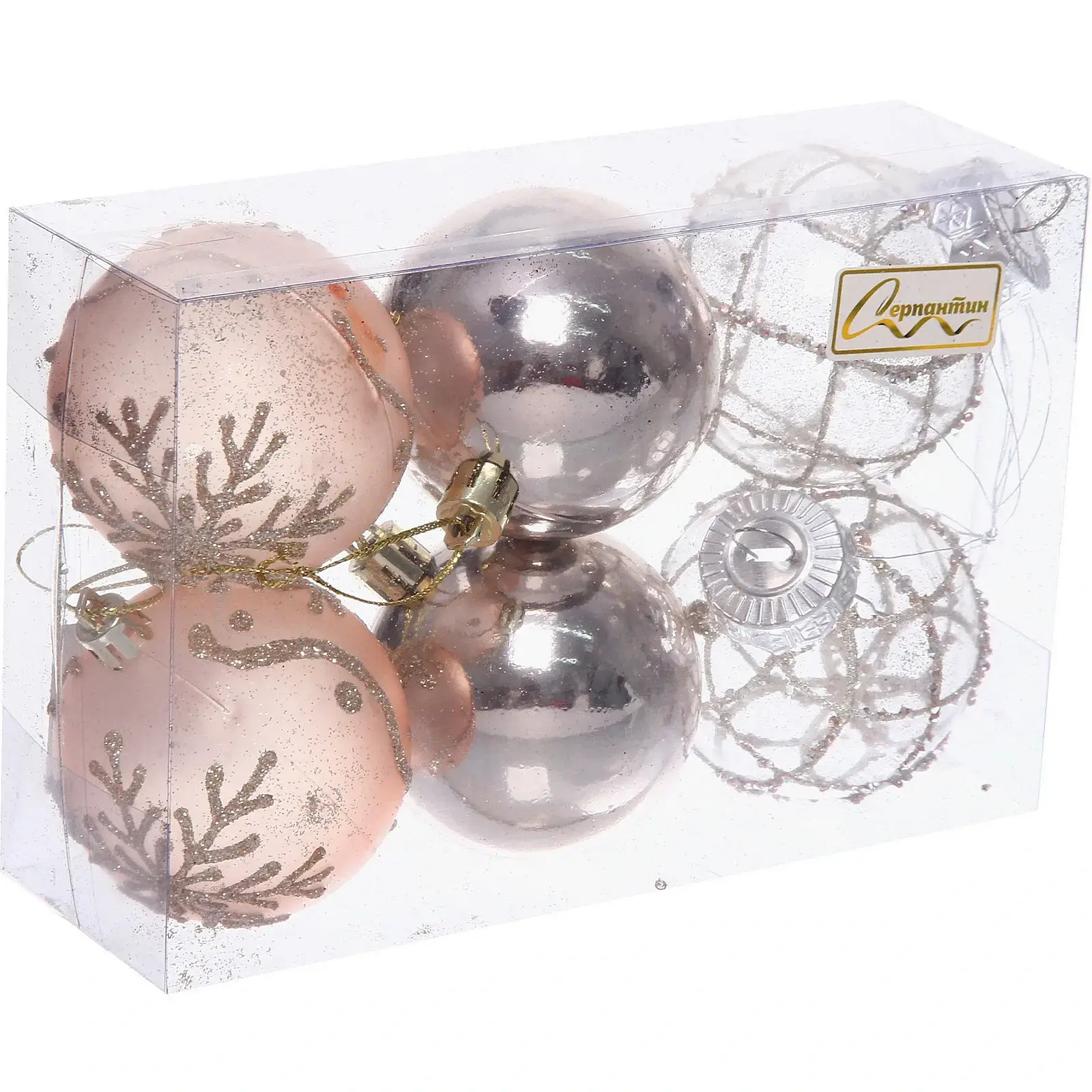 Размер каждого шара: диаметр 6 см. Материал: высококачественный пластик. В набор входит 6 штук, что достаточно для украшения средних и крупных елок.