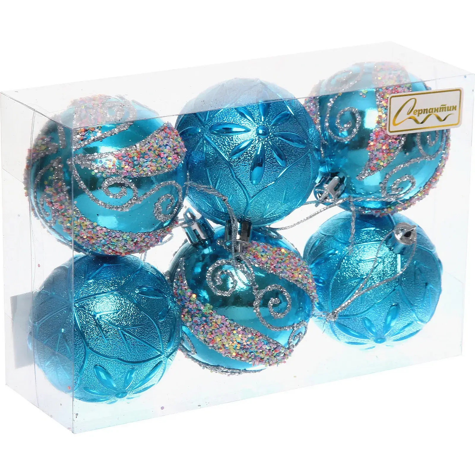 В набор входит 6 шаров лазурного цвета. Материал: высококачественный пластик. Производитель: компания Hua Sheng Industrial Co.,LTD (Китай). Бренд: Серпантин. Шары подходят для украшения как искусственных, так и живых ёлок.