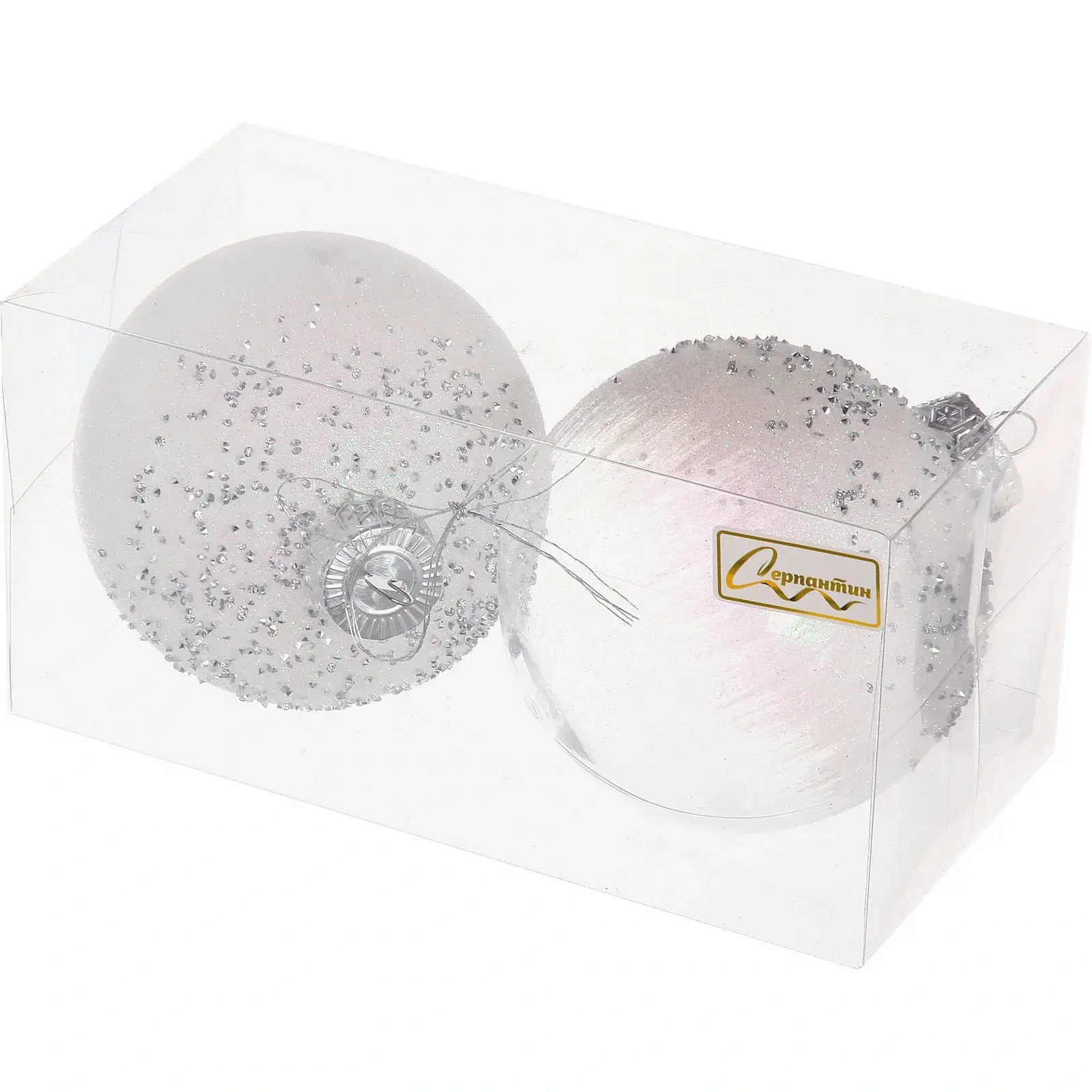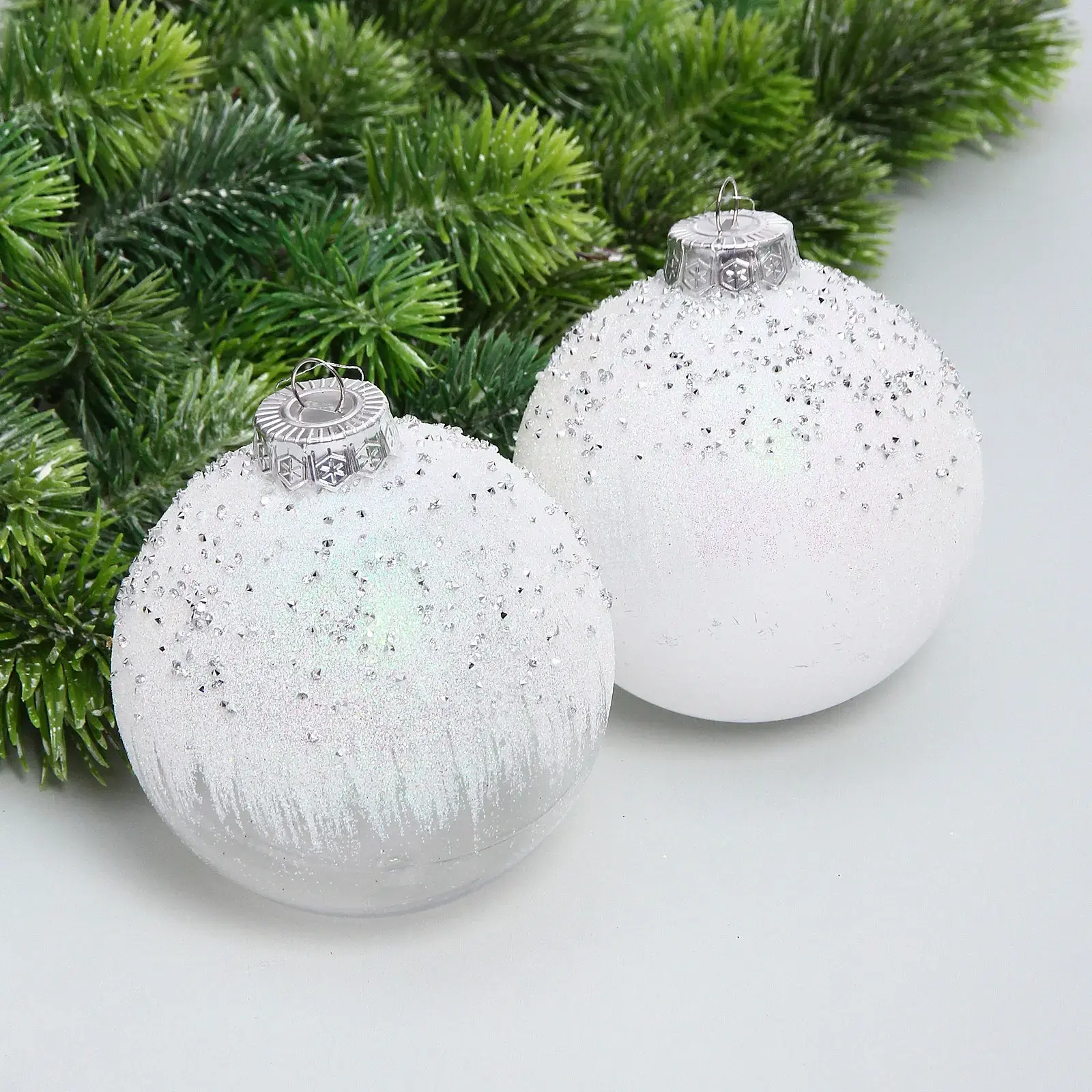 Шары изготовлены из качественного пластика, устойчивого к повреждениям. Размер каждого шара составляет 10 см. В набор входят два шара в белом цвете с различными эффектами напыления. Металлические подвески обеспечивают надежную фиксацию на ветках елки.