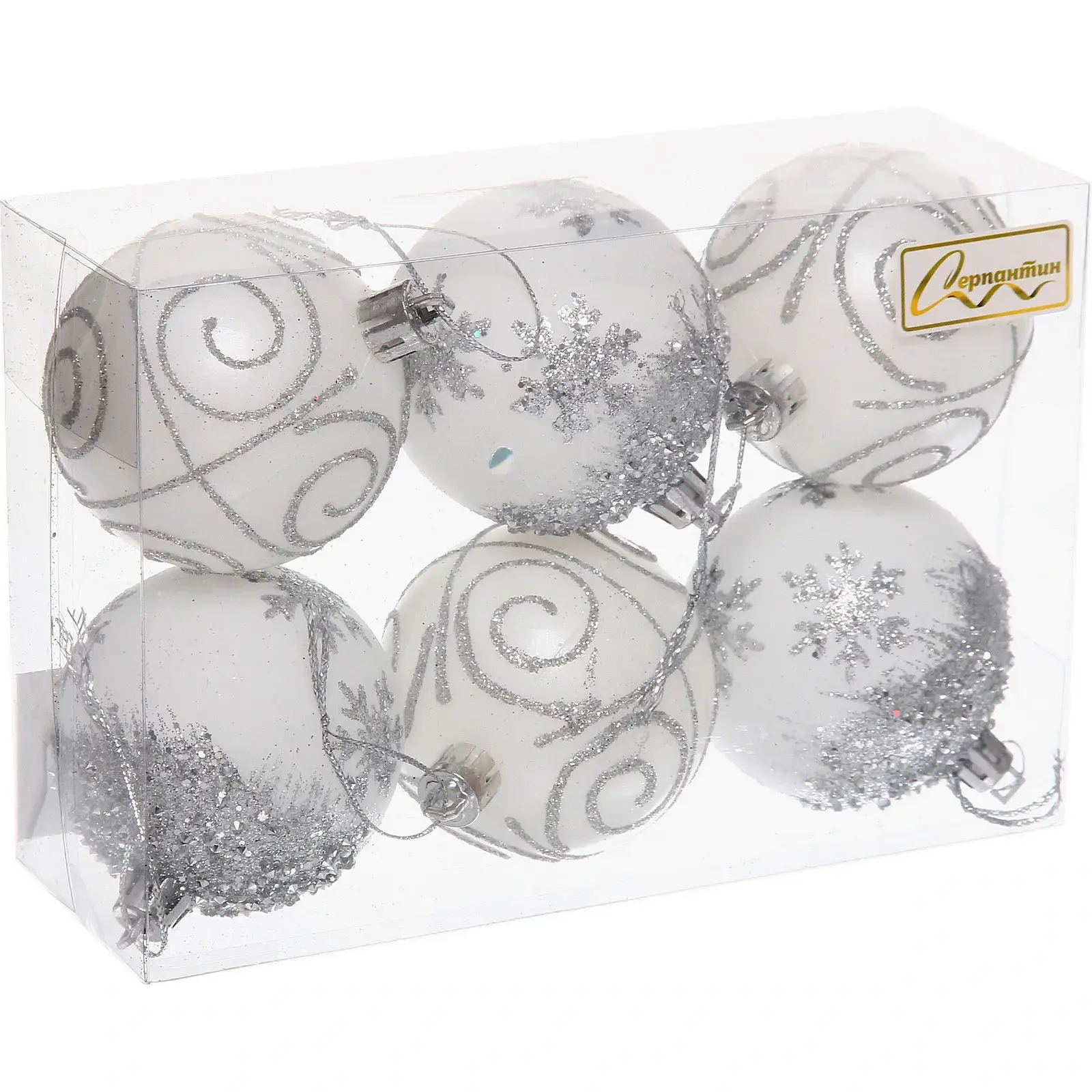 Шары диаметром 6 см выполнены из прочного пластика с аккуратным декоративным покрытием. На поверхности - изящные узоры в виде спиралей и снежинок, создающие эффект мерцающего снега.