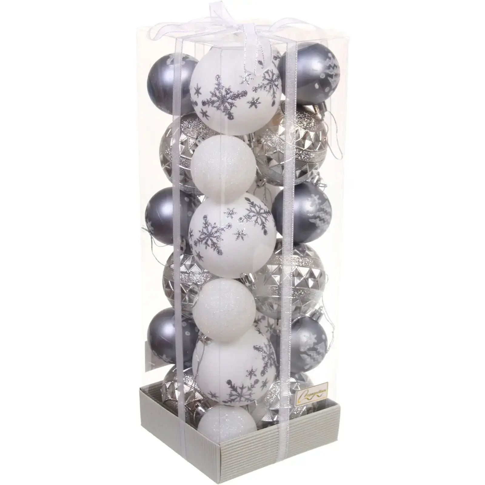 Набор состоит из 24 шаров различных размеров: 12 шаров диаметром 7 см и 12 шаров диаметром 5 см. Они идеально подходят для украшения елки, создания праздничных композиций или декорирования интерьера. Шары легко подвешиваются благодаря петелькам, что делает процесс украшения простым и приятным.