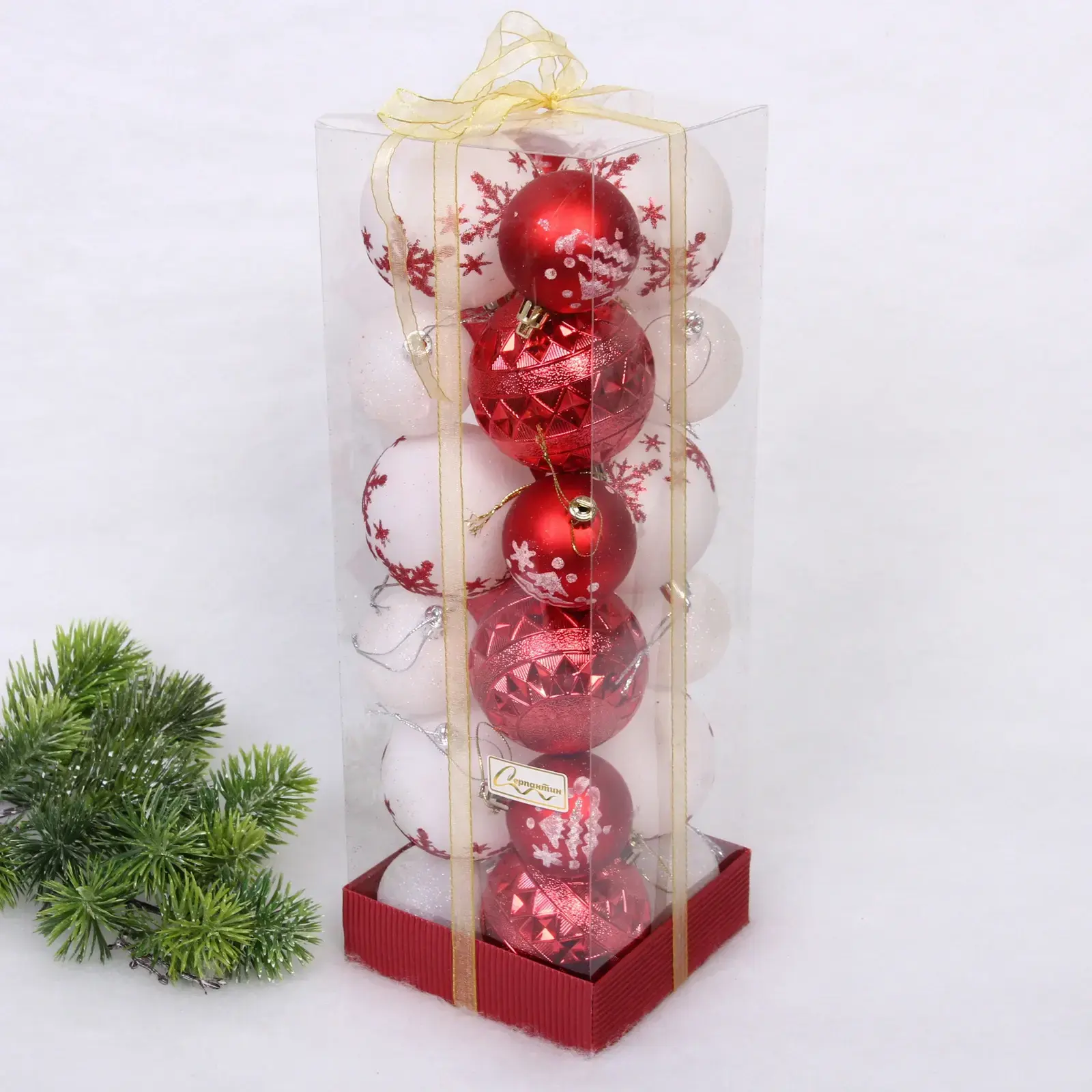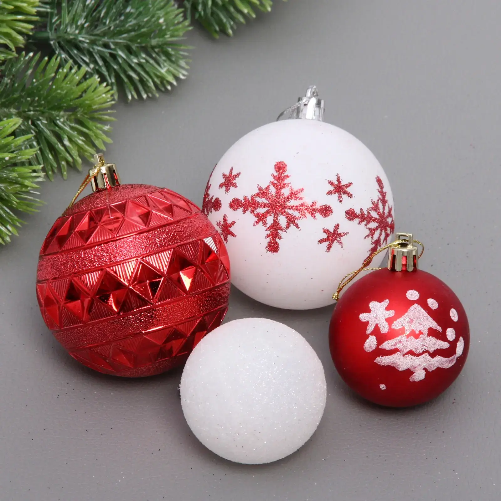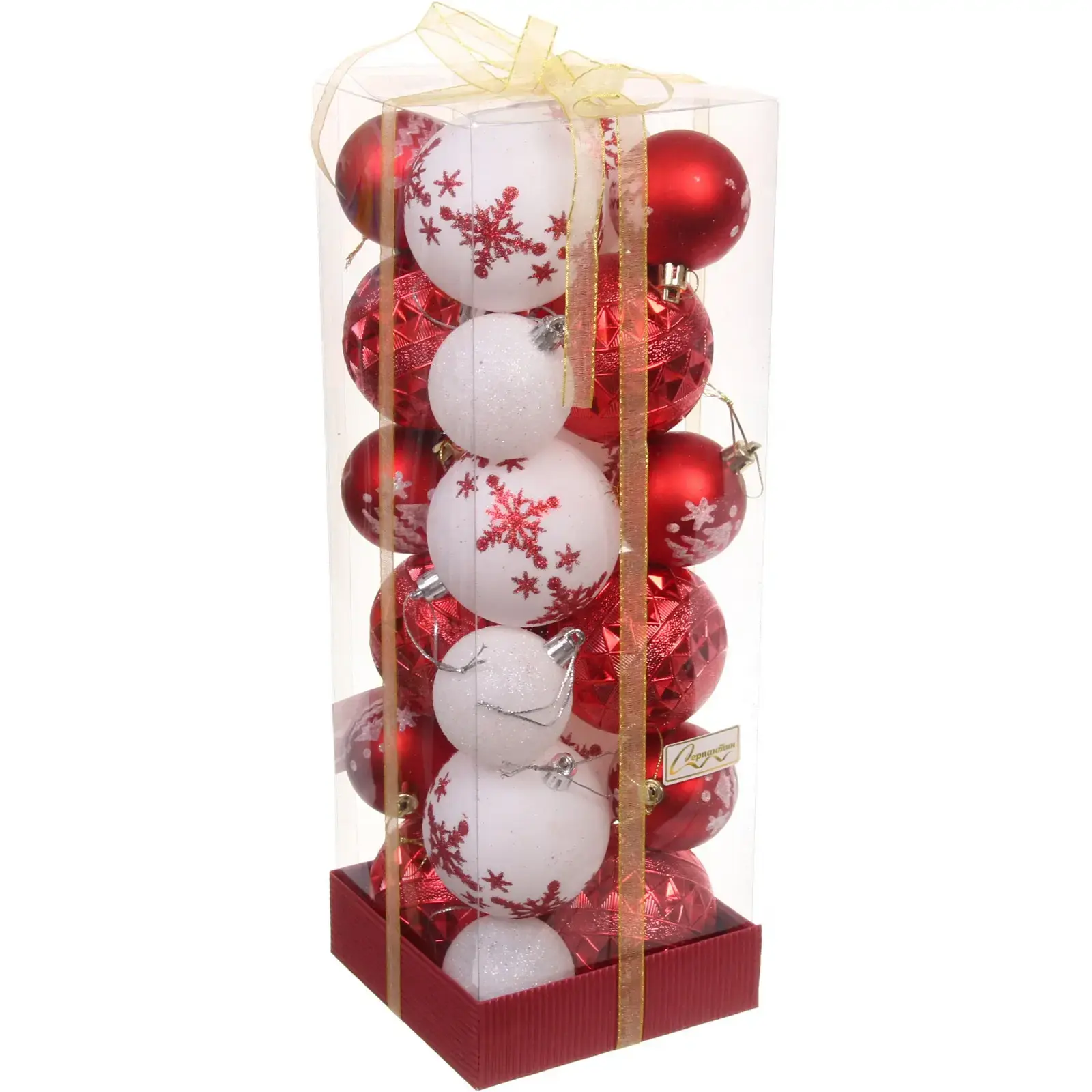 Шары имеют различные текстуры: гладкие, рифленые и с узорами снежинок, что добавляет интересный визуальный эффект. Упаковка выполнена в прозрачном пластиковом корпусе с красной основой и золотистой лентой, что делает набор отличным подарком. Размеры упаковки компактные, что удобно для хранения и транспортировки.