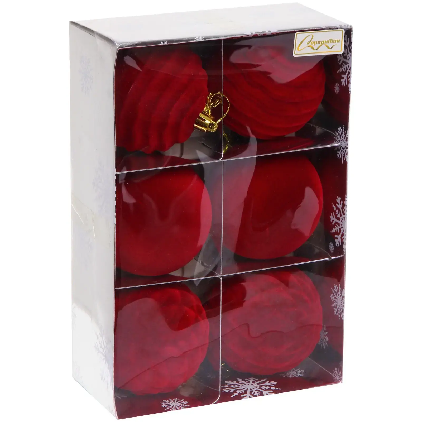Шары диаметром 8 см изготовлены из высококачественного пластика с велюровым покрытием. Комплект включает три гладких и три рифленых шара, создавая гармоничную композицию. Стильная упаковка с прозрачной крышкой позволяет легко оценить содержимое и служит надежной защитой при хранении.
