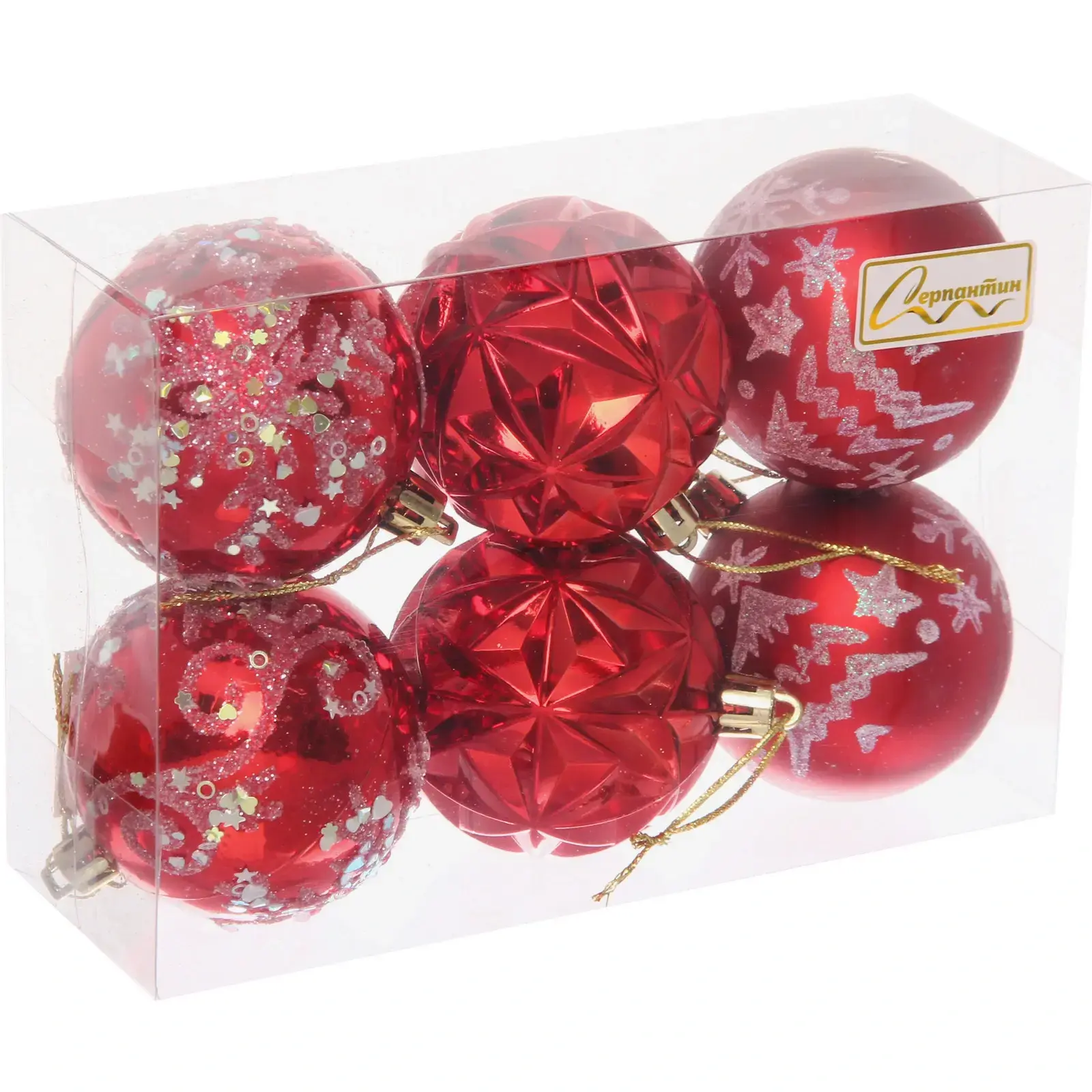 Размер каждого шара: 6 см. В набор входит 6 штук. Материал: пластик. Цвет: красный с золотыми элементами.