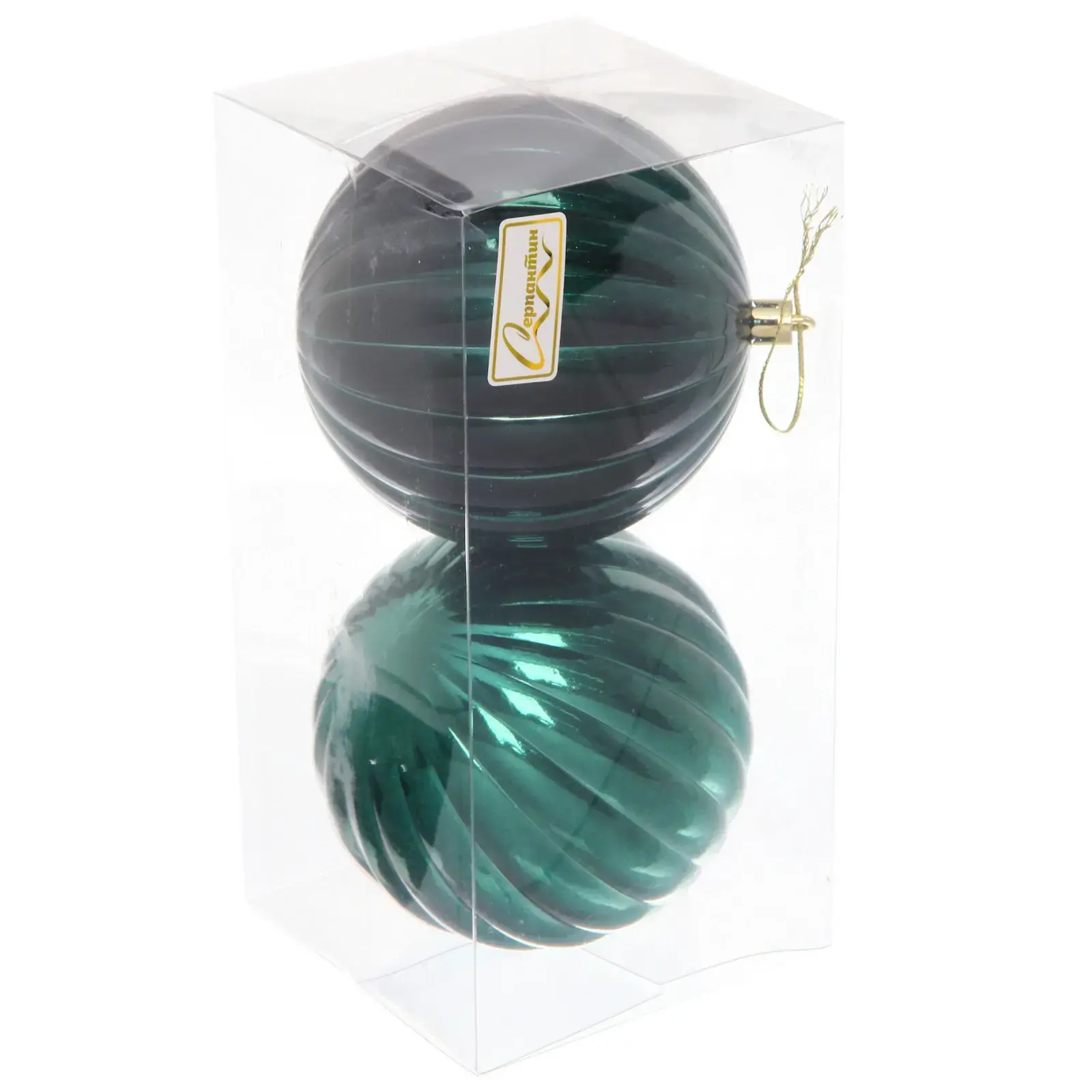 Точный размер каждого шара - 10см в диаметре. Комплект состоит из двух изделий: один темно-изумрудного цвета, второй - более светлого оттенка, что позволяет создать красивую цветовую композицию.