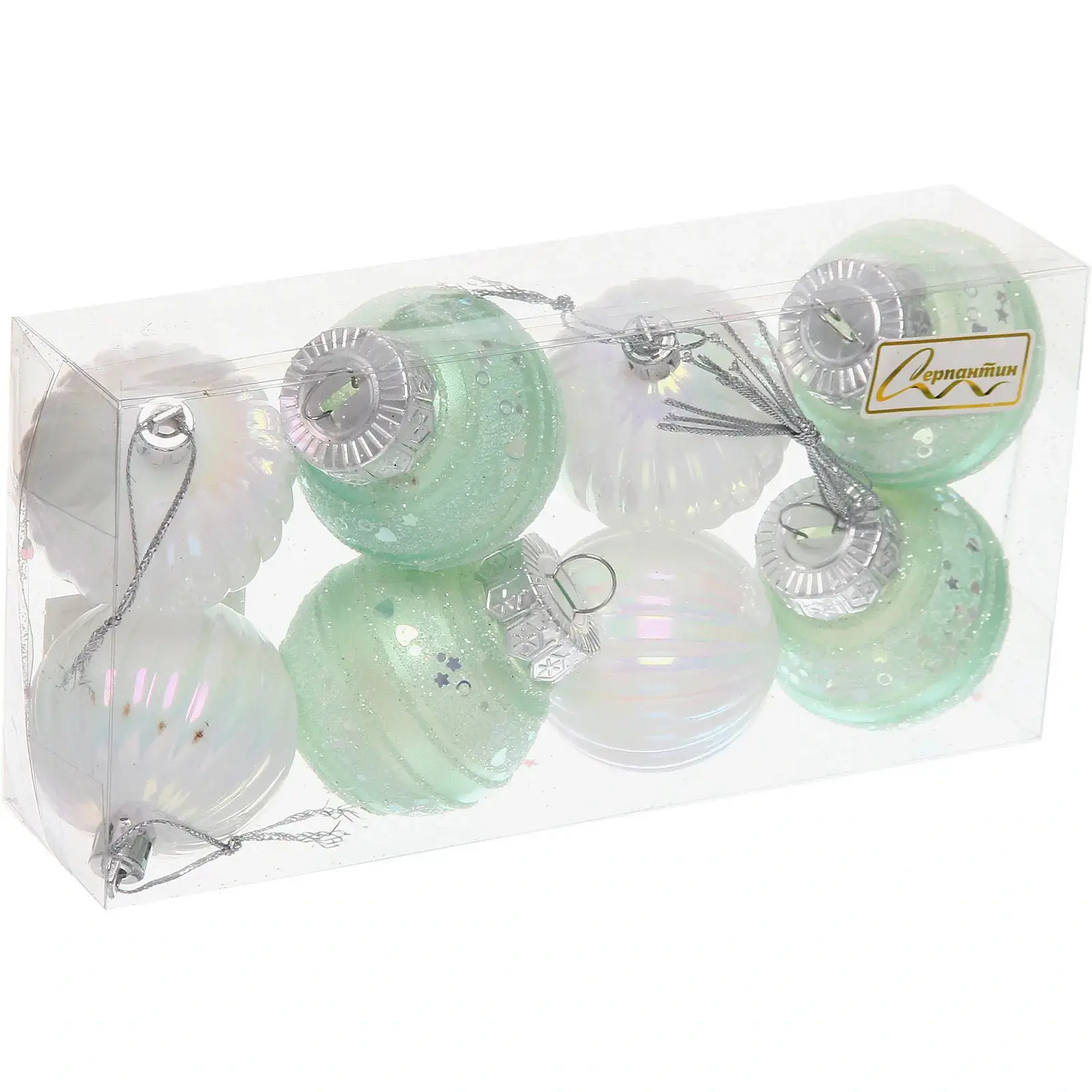 Шары диаметром 5 см выполнены из качественного пластика, имитирующего стекло. Комплект включает 8 штук в белом и нежно-зеленом цветах, что создает элегантную цветовую гамму.