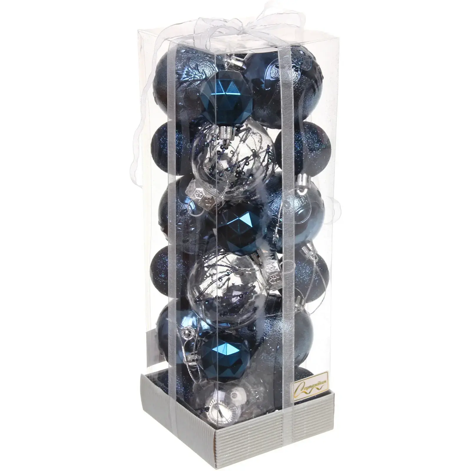 В наборе 24 шара из пластика: сочетание круглых и граненых форм, вариант отделки — от зеркального глянца до переливающихся блесток. Универсальность цветов позволяет комбинировать с любым интерьером. Набор станет удачным выбором для стильного и безопасного новогоднего оформления.