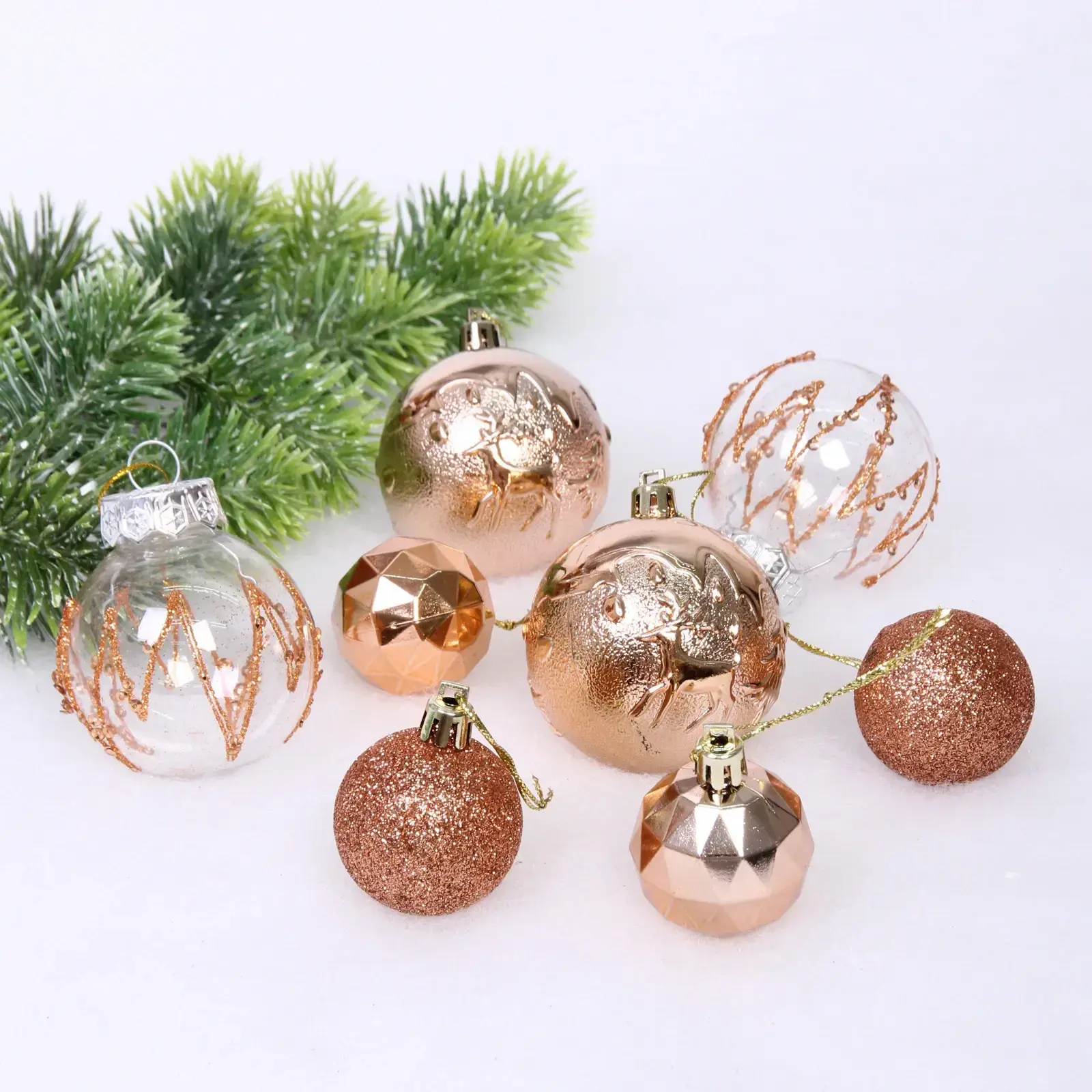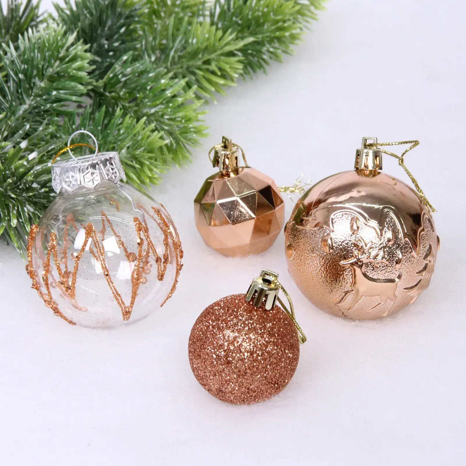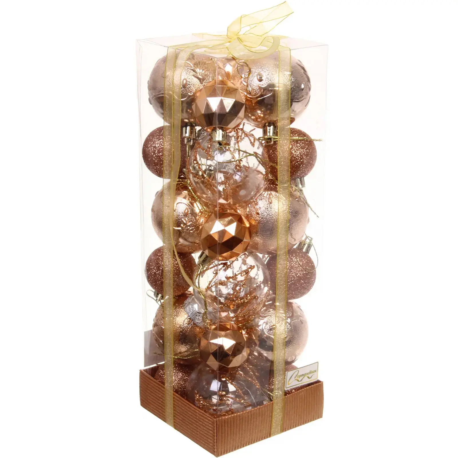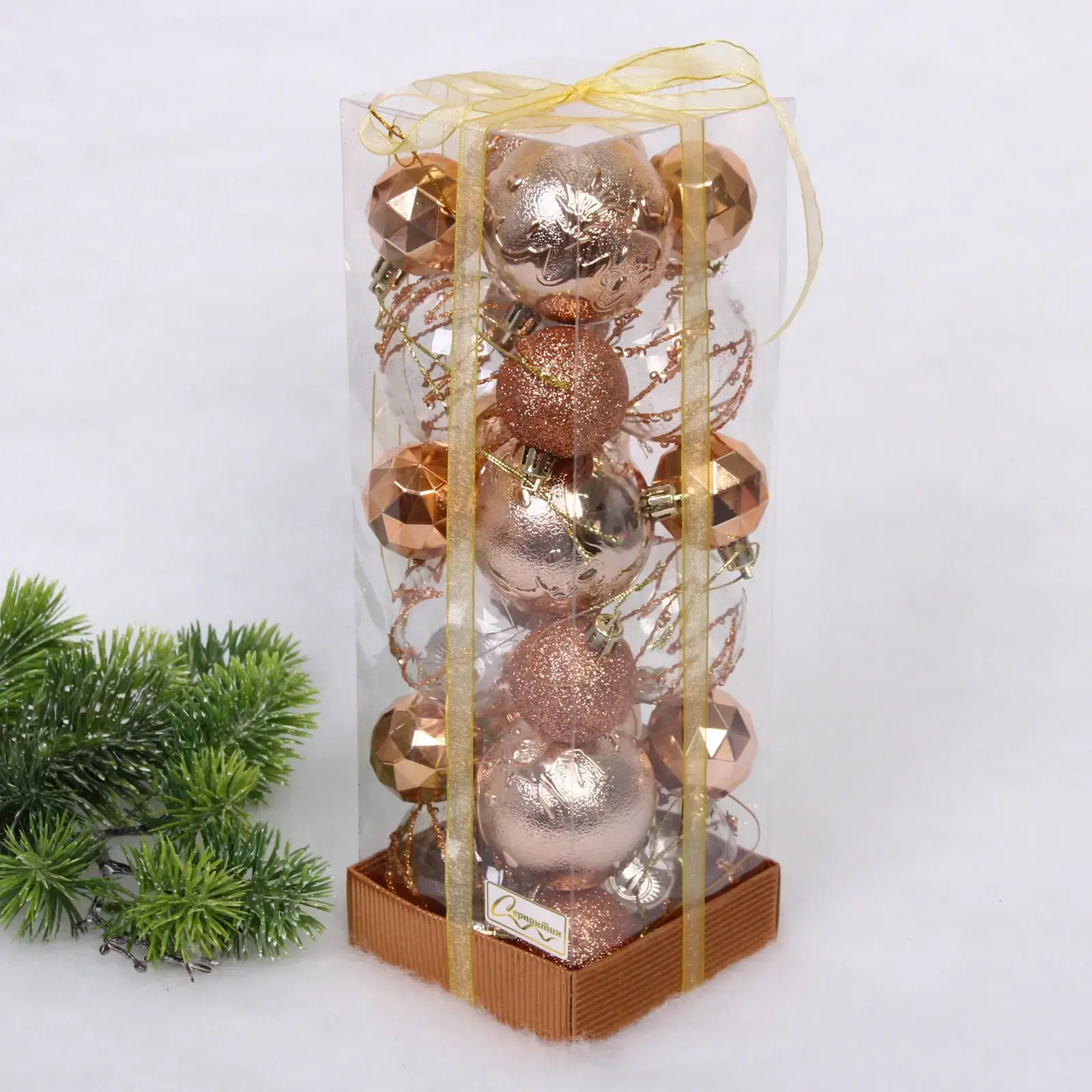 Каждый шар в наборе имеет уникальный дизайн: от гладких до блестящих поверхностей, что делает их идеальными для создания многослойного и объемного декора. Размеры шаров (6 см и 4 см) позволяют комбинировать их в различных композициях, а упаковка с золотистой лентой добавляет элегантности. Набор упакован в прозрачную коробку, что делает его отличным подарком для друзей и близких.