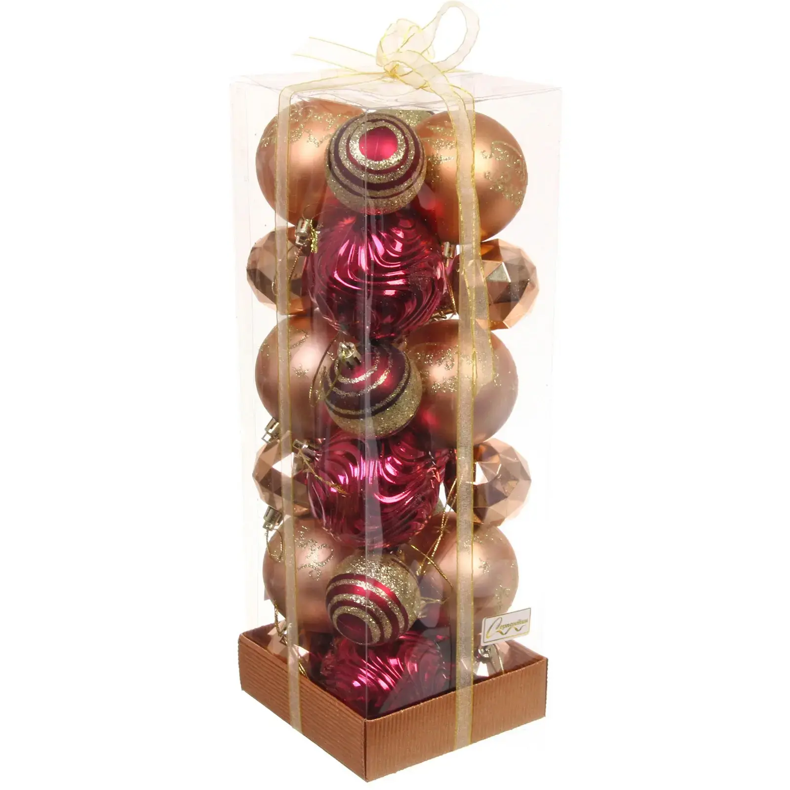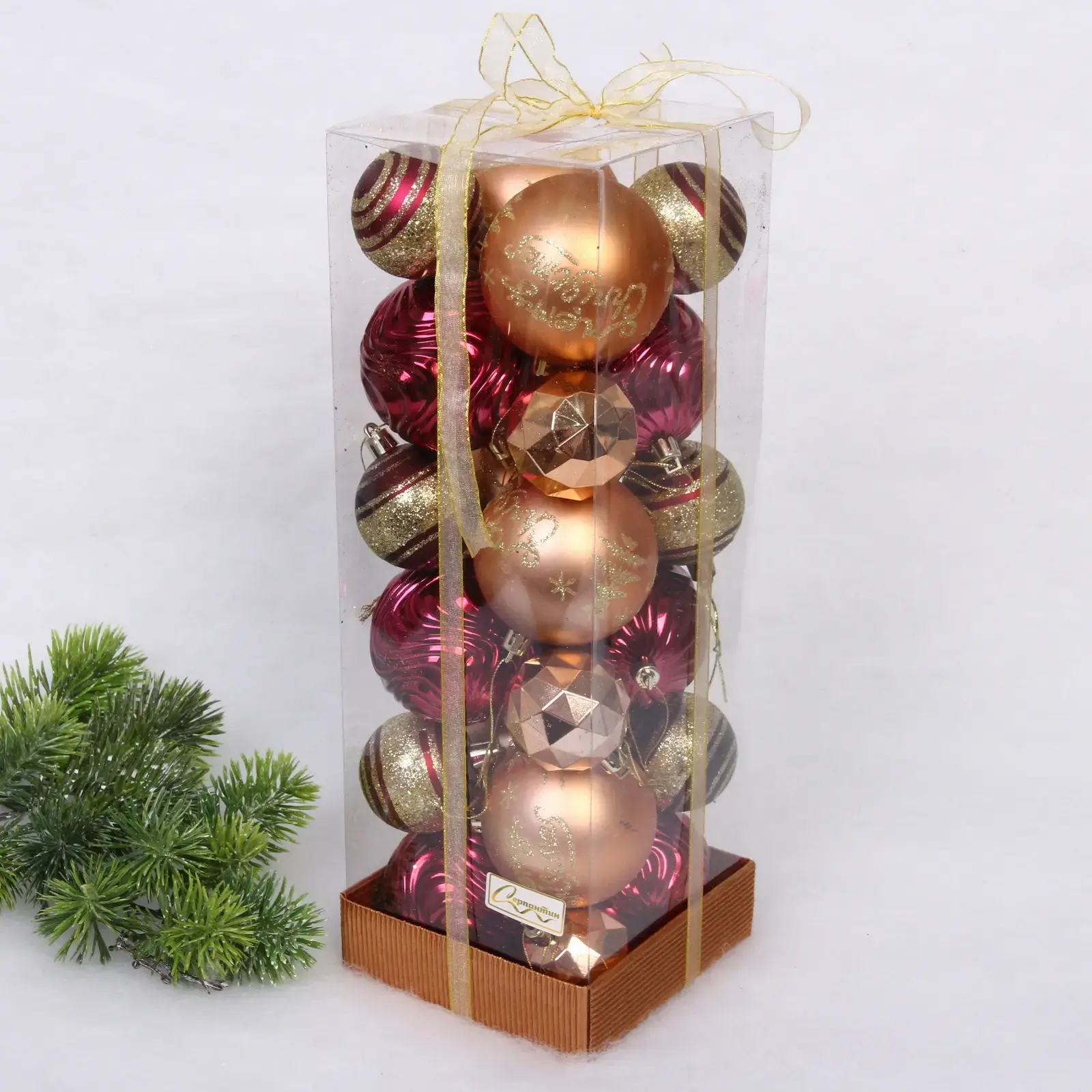 Размеры шаров: 7 см и 5 см. Материал: пластик. Набор включает 24 предмета, что позволяет вам украсить елку или создать праздничные композиции в любом уголке вашего дома. Упаковка выполнена из прозрачного пластика с золотистой лентой, что делает его отличным подарком для близких.