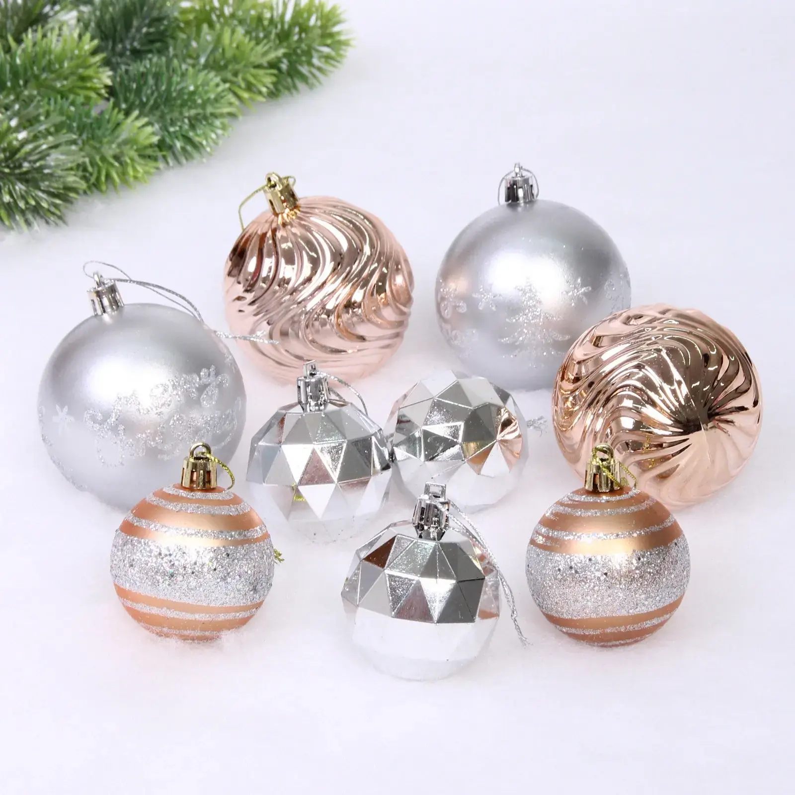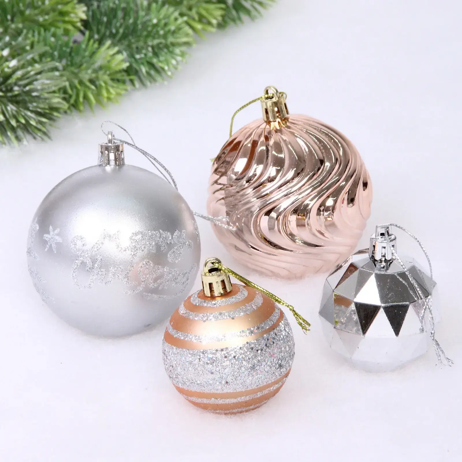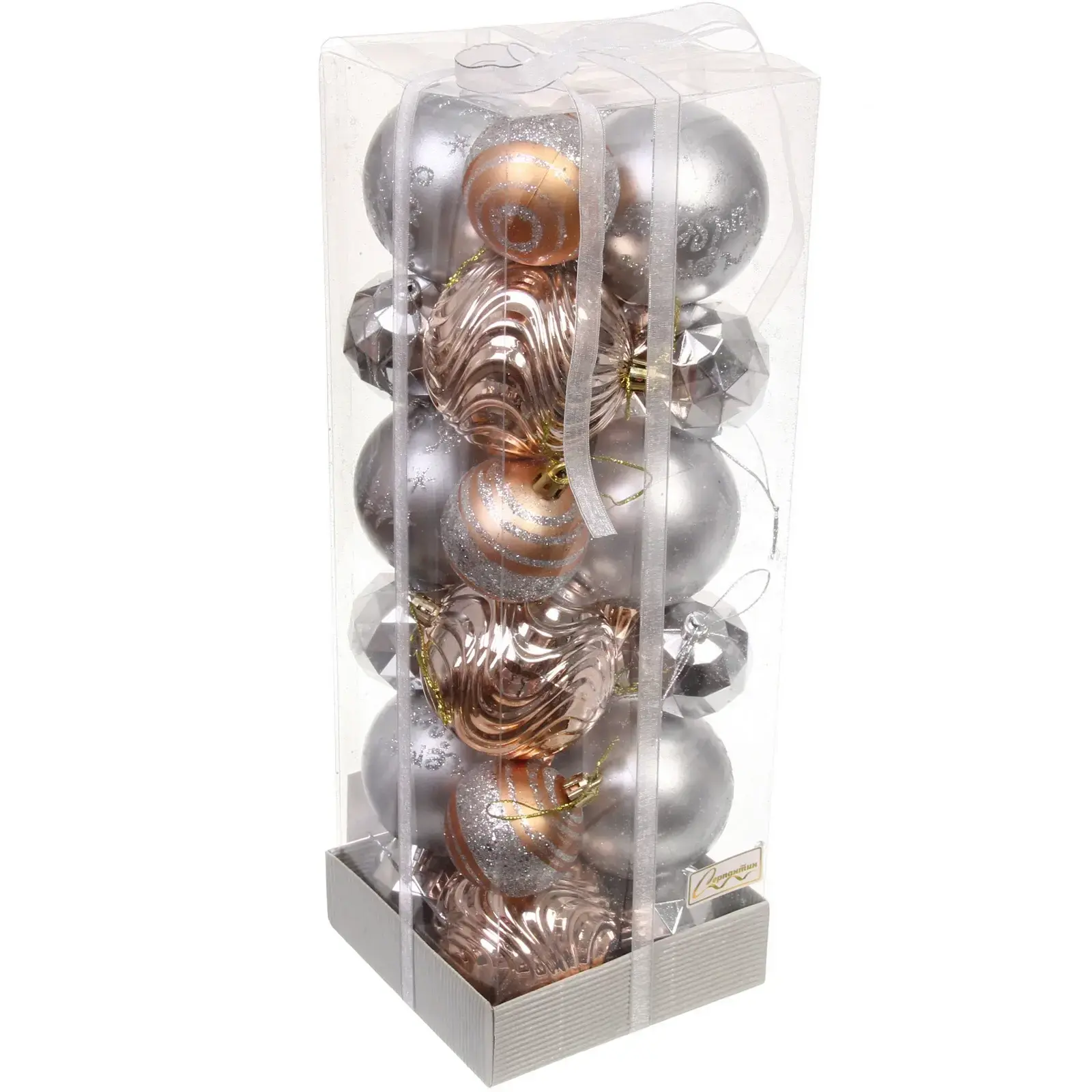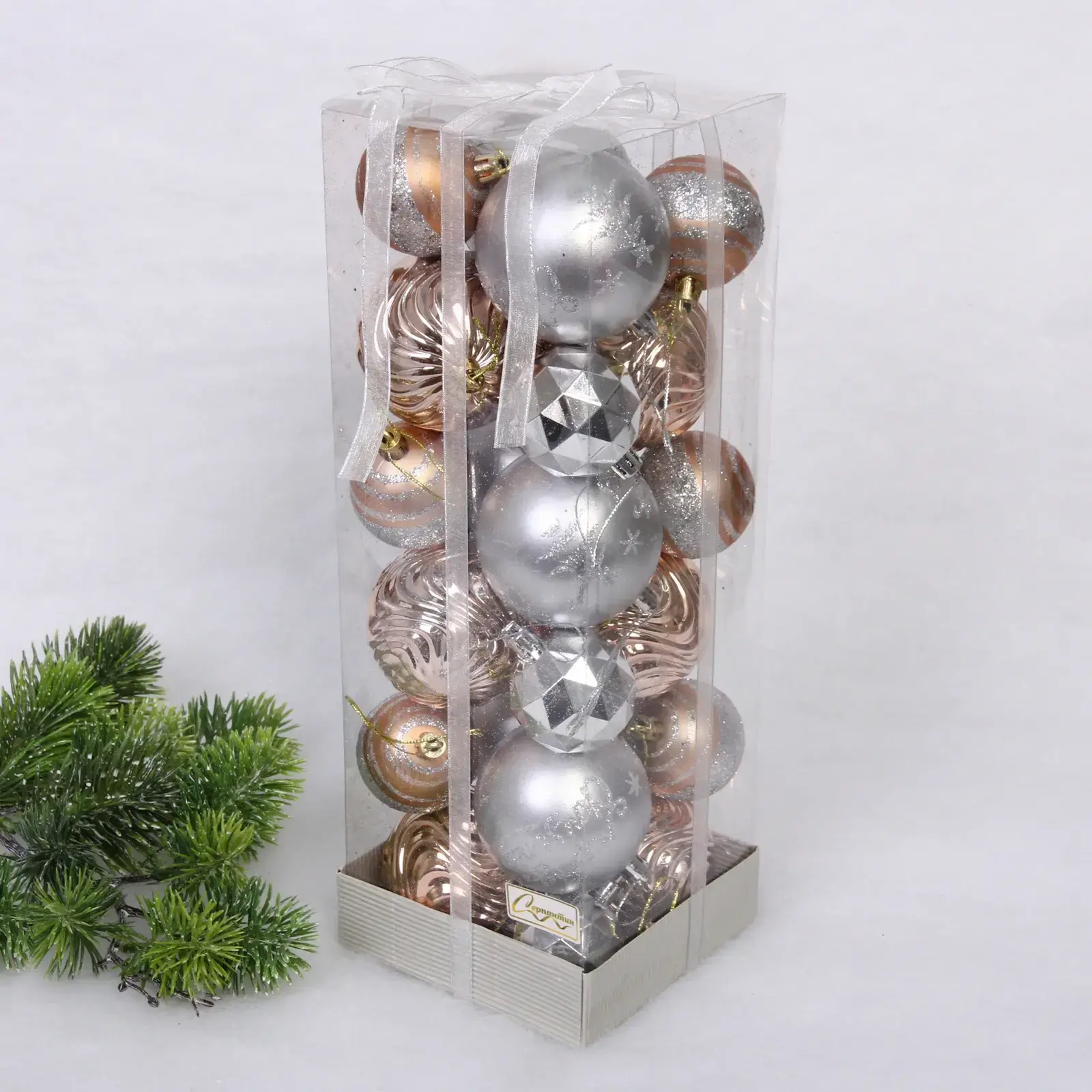 Размеры шаров: 7 см и 5 см. Материал: пластик. Набор включает 24 шара различных дизайнов и текстур, что позволяет вам создать уникальный новогодний стиль. Упаковка выполнена в прозрачном дизайне, что делает ее привлекательной и удобной для хранения.
