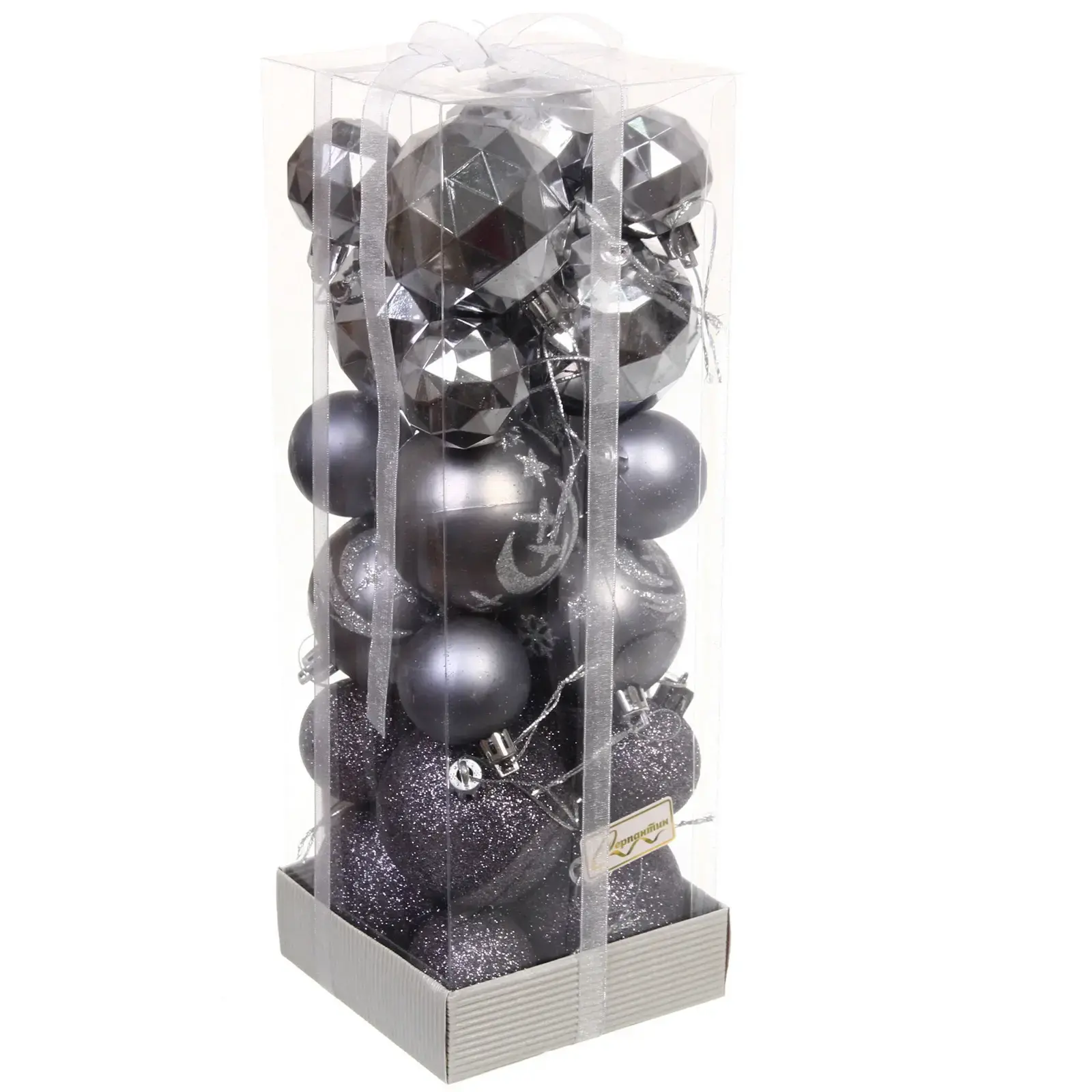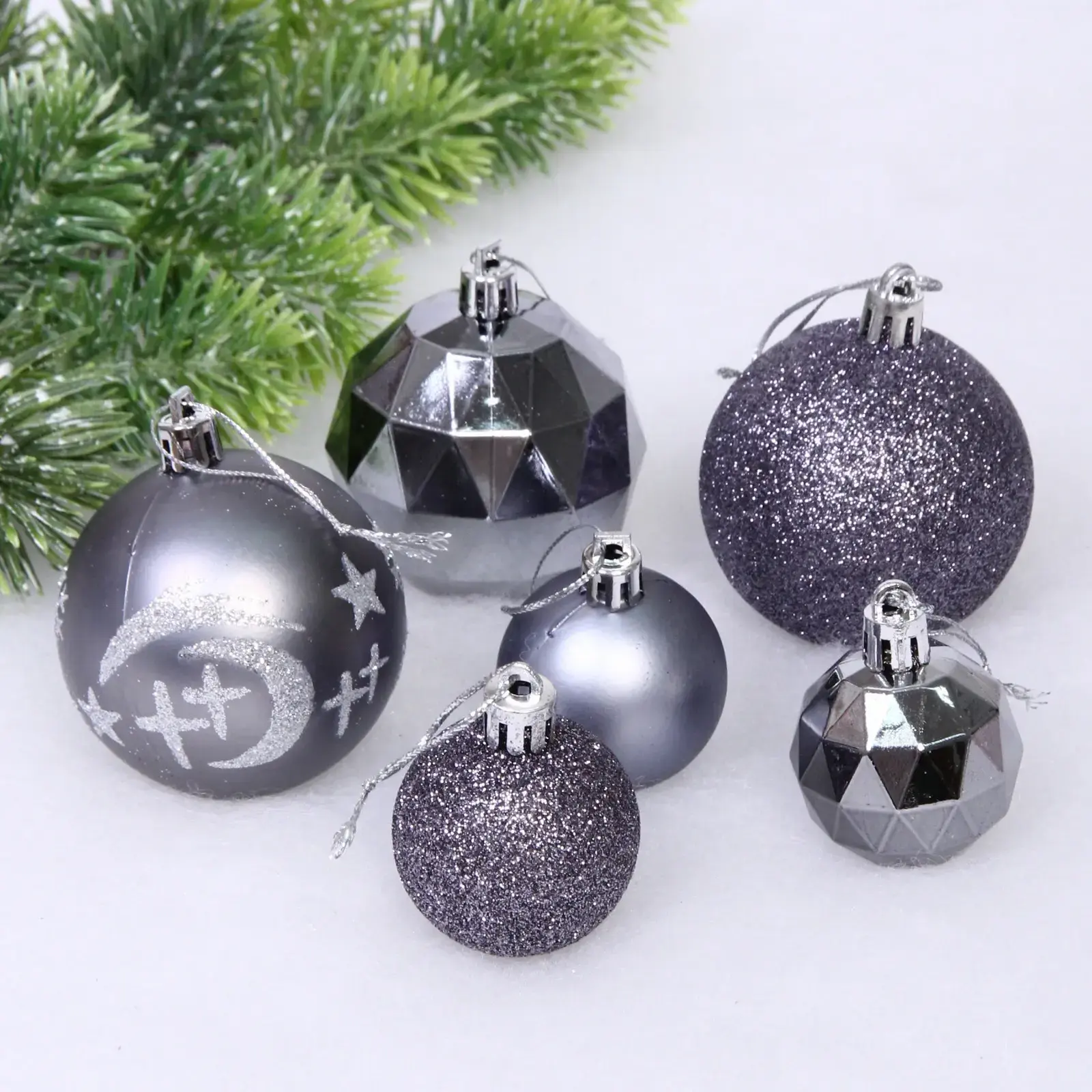 Этот набор новогодних шаров станет идеальным дополнением к вашему праздничному декору. Сочетание графитовых оттенков и разнообразных текстур придаст вашему интерьеру стильный и современный вид. Шары разных форм и размеров, включая 6 см и 4 см, позволят вам создать уникальные композиции на вашей елке или в интерьере.