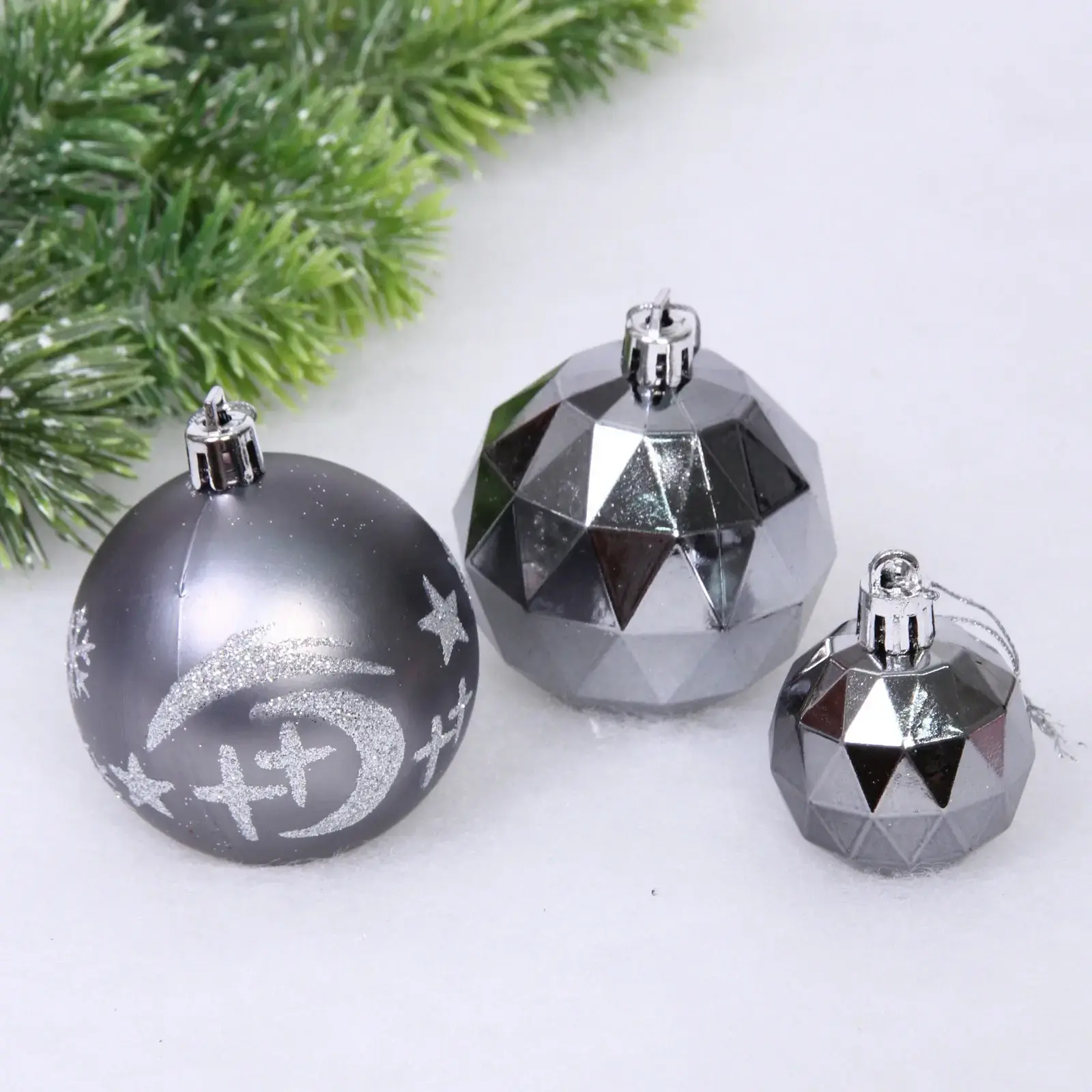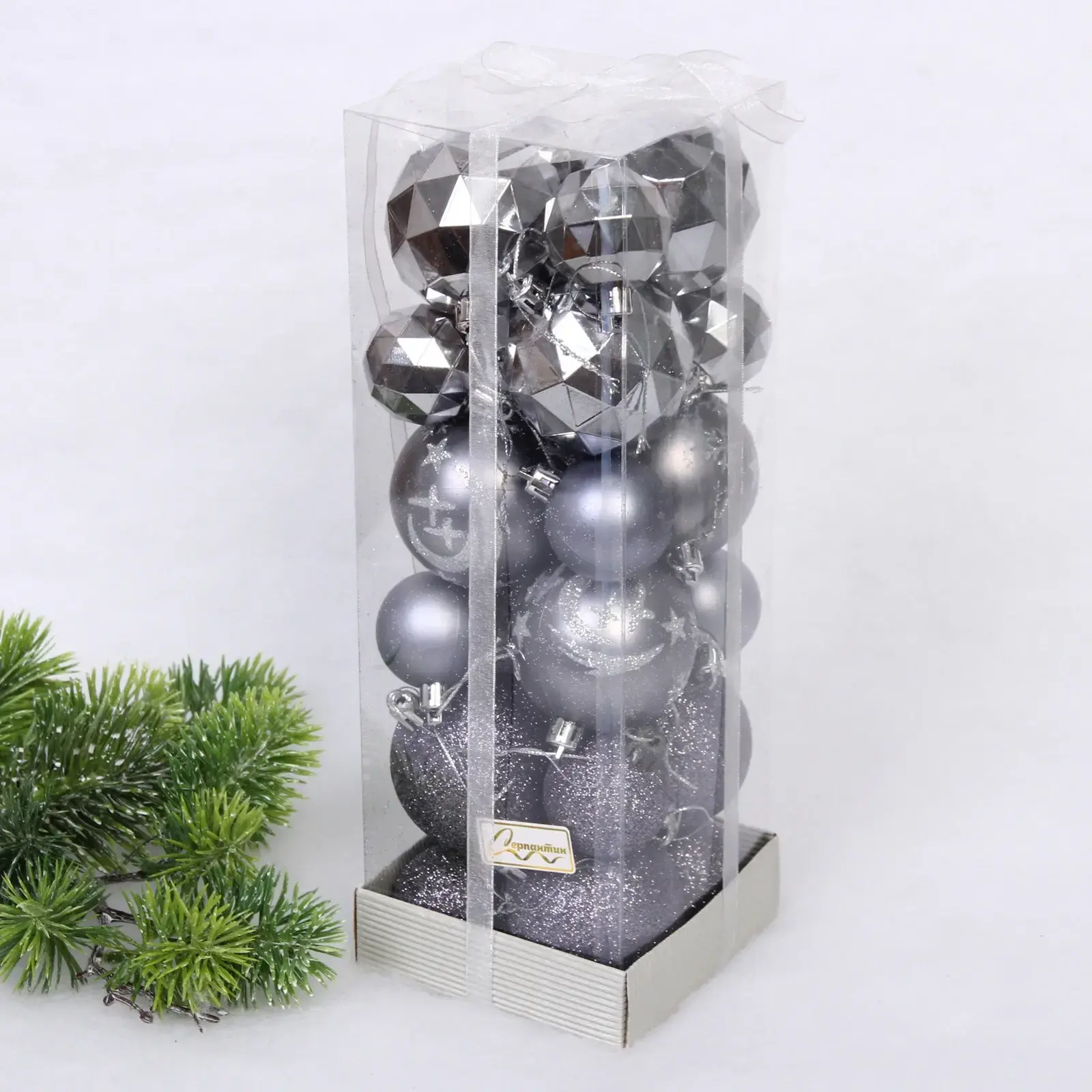 В наборе 24 предмета, что позволяет вам создать полноценный декор. Шары выполнены из прочного пластика, что обеспечивает их долговечность и устойчивость к повреждениям. Размеры шаров: 6 см и 4 см, что делает их универсальными для любого стиля оформления.