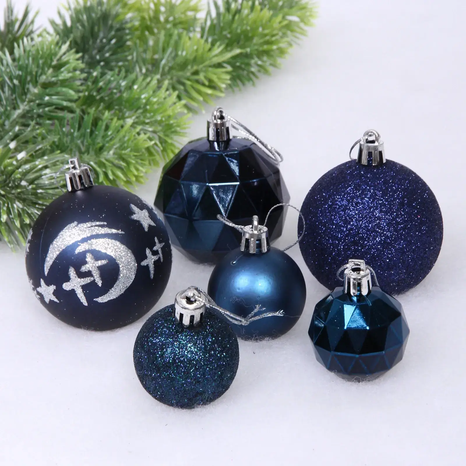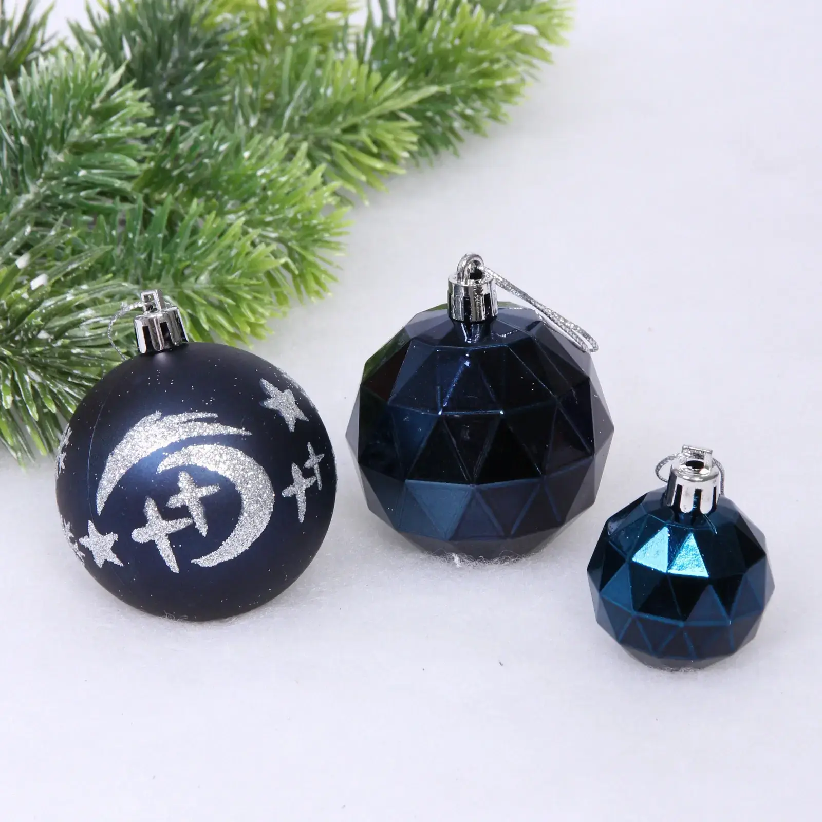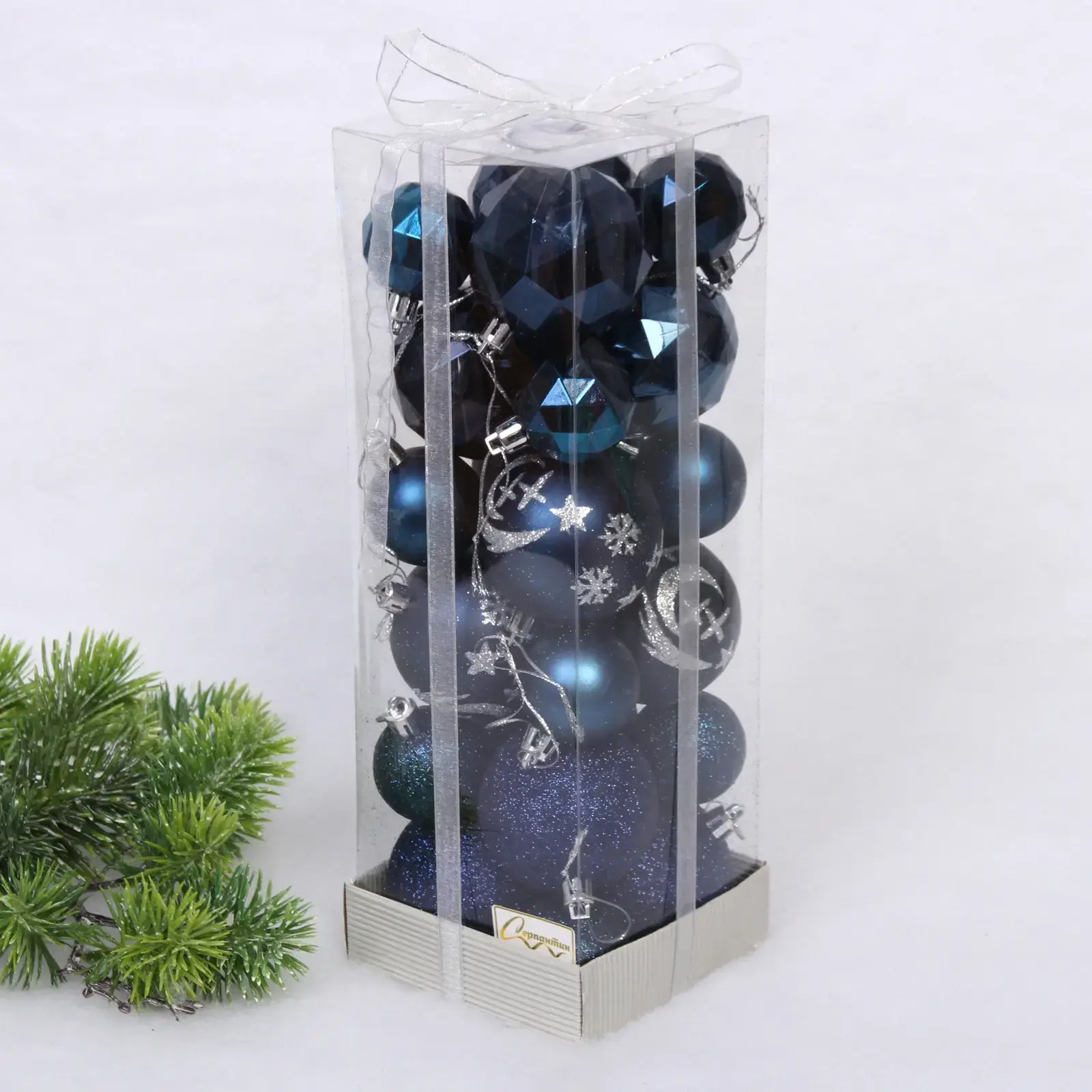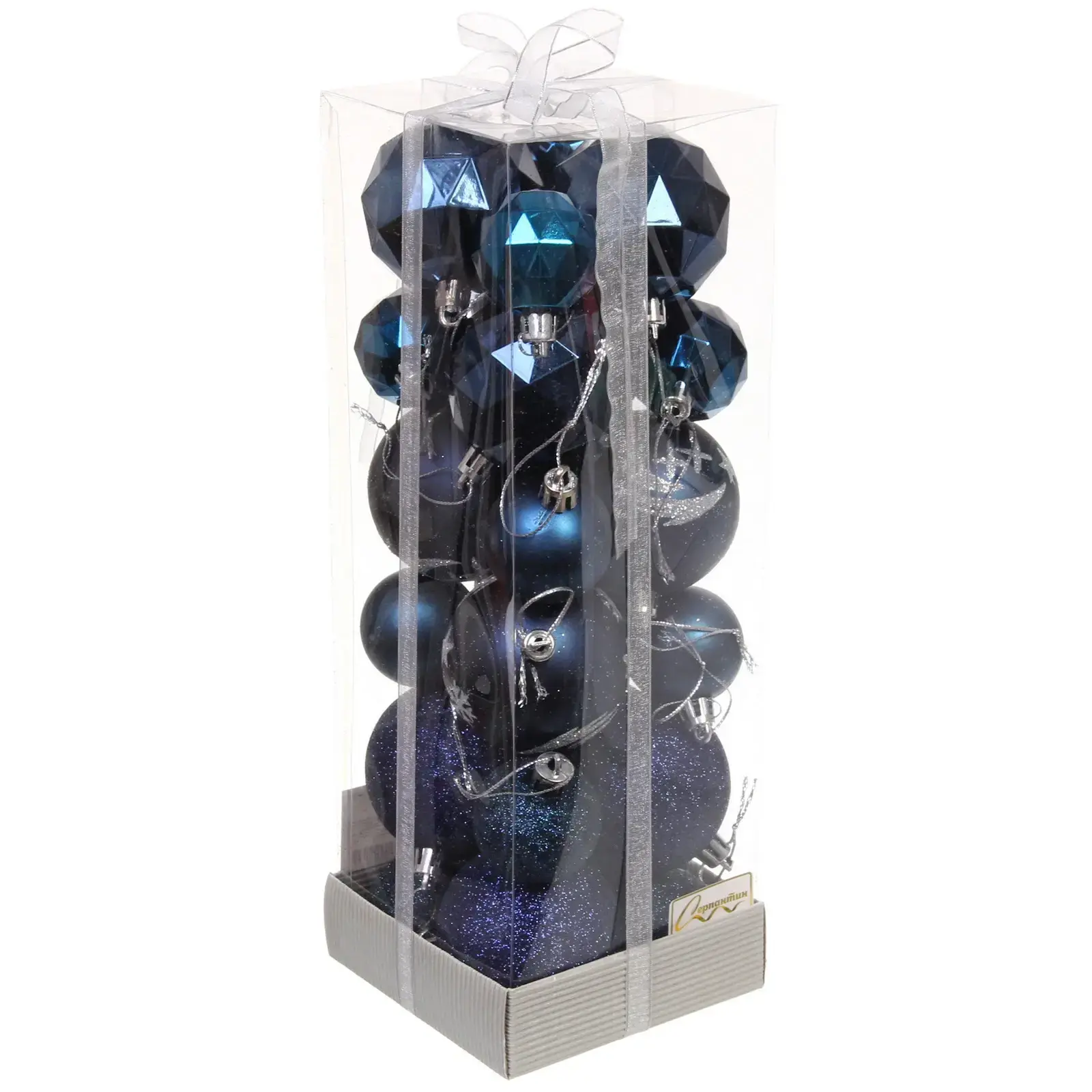 В наборе 24 шара: диаметром 6 и 4 см, материал — пластик, оформление — матовые, глянцевые, глиттерные и фигурные элементы. Все украшения имеют прочные металлические крепления для лёгкого размещения. Удобная упаковка не только сохраняет целостность игрушек, но и помогает их стильно презентовать или хранить после праздников.