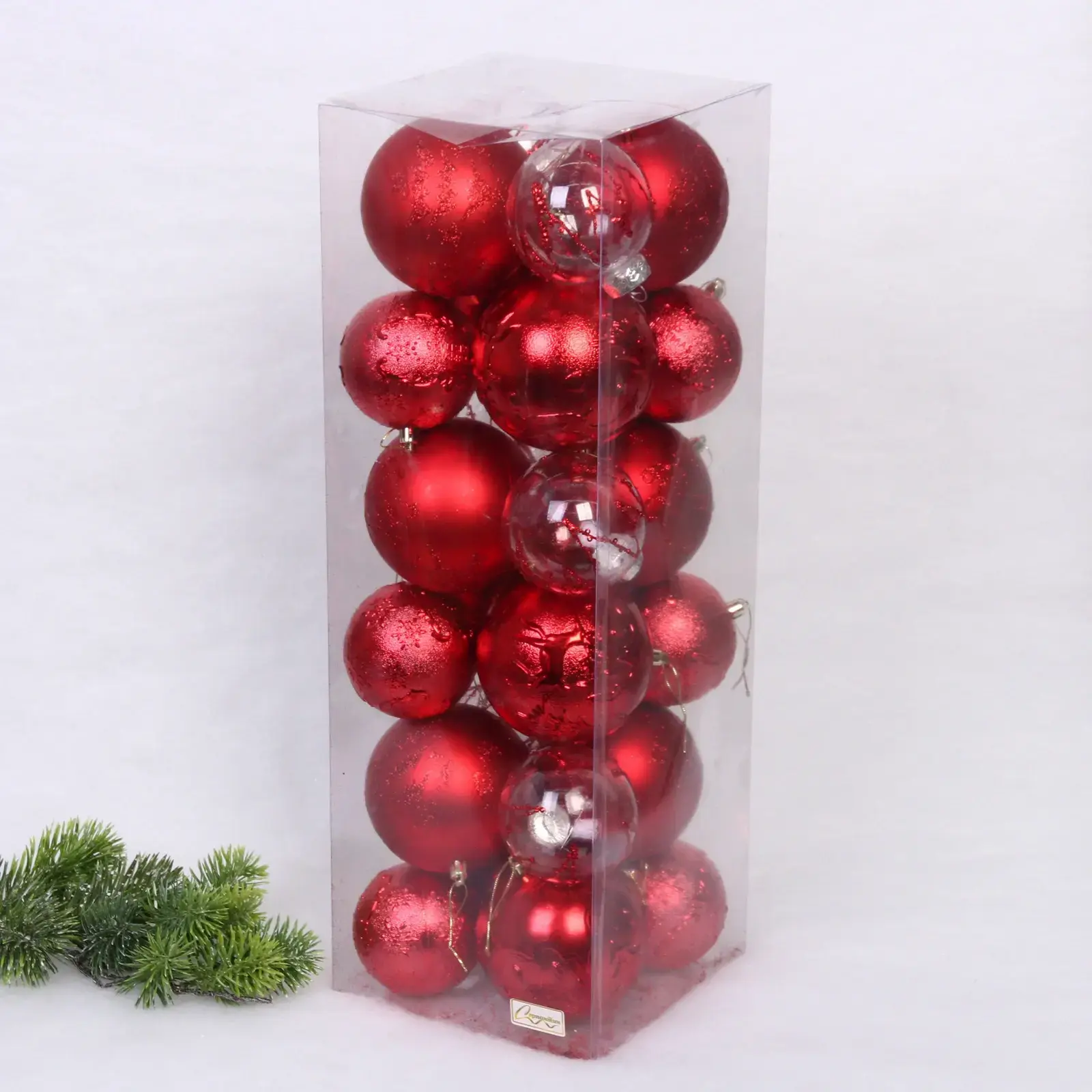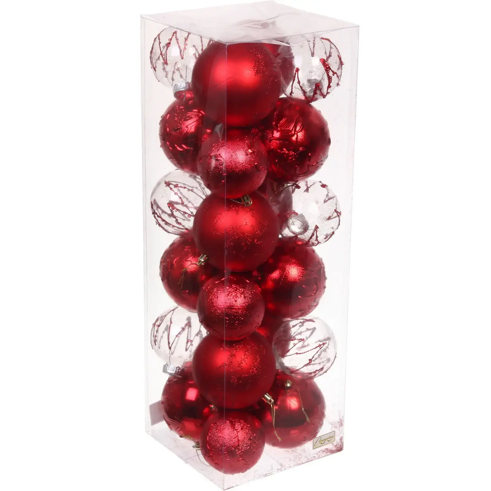Размеры шаров: 8 см и 10 см. Материал: пластик. Набор включает 24 предмета, что позволяет вам создать полноценный новогодний декор. Упаковка прозрачная, что позволяет видеть содержимое и удобно хранить шары после праздников.