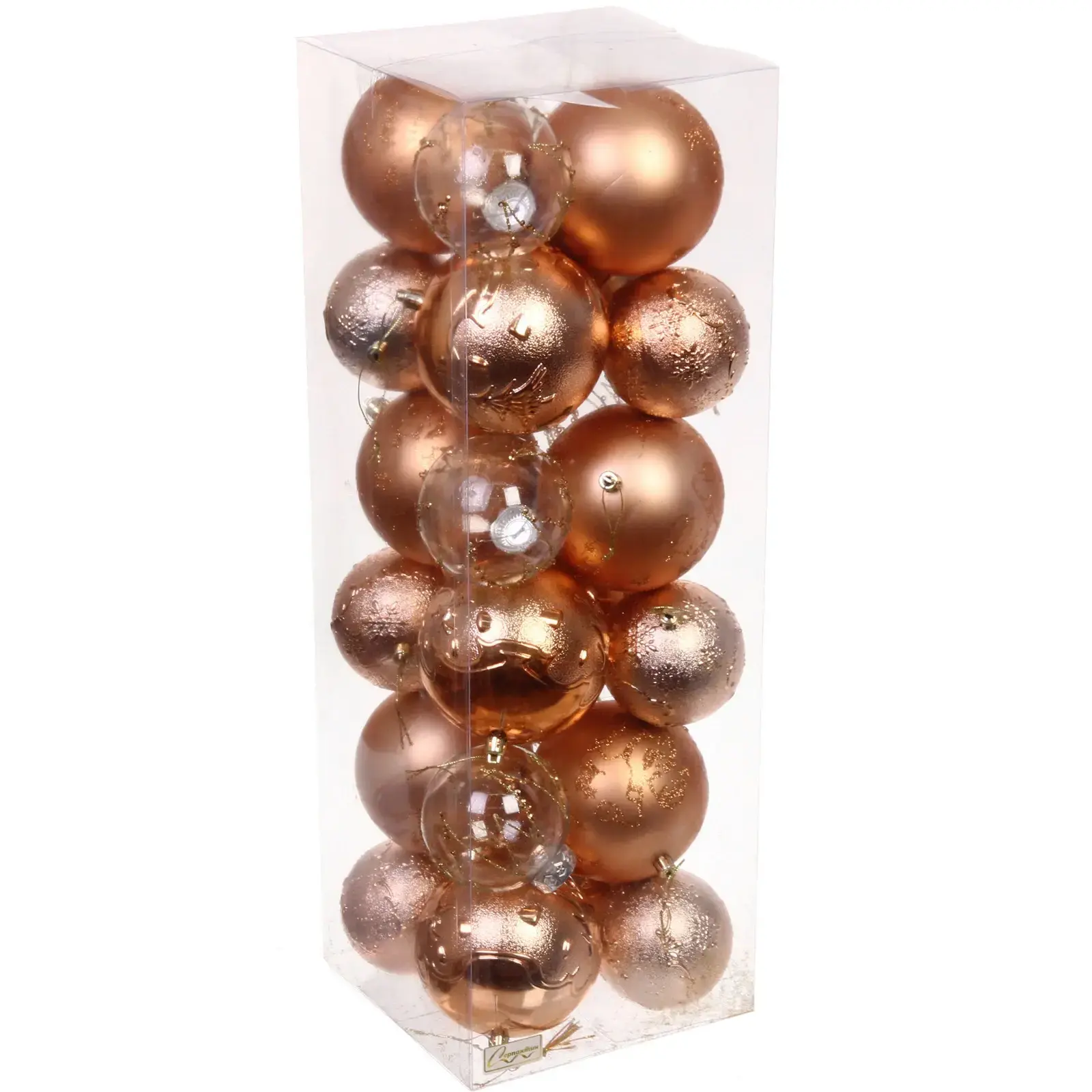 В наборе вы найдете 24 шара, что позволит вам украсить даже самую большую елку. Шары имеют как матовые, так и блестящие поверхности, что добавляет глубину и текстуру вашему декору. Упаковка выполнена из прозрачного пластика, что позволяет удобно хранить шары и защищает их от повреждений.