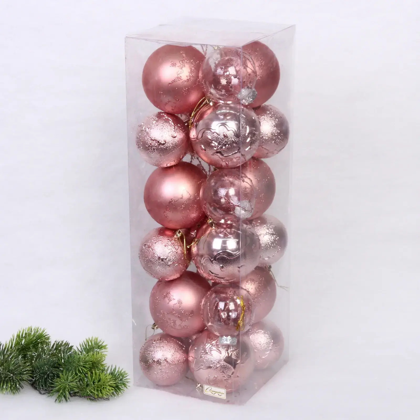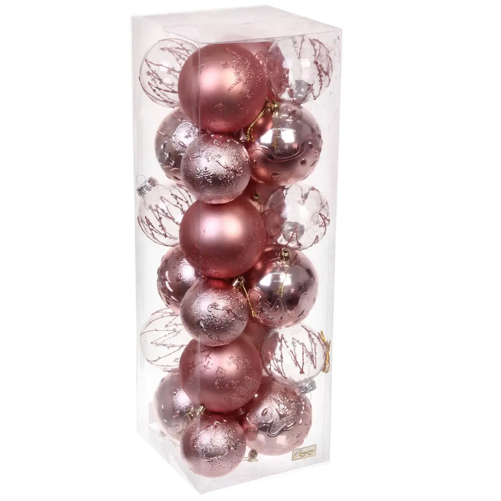 Размеры шаров: 8 см и 10 см, что делает их универсальными для любого стиля оформления. Набор включает 24 предмета, что позволяет вам создать гармоничное и стильное оформление. Розовое золото в сочетании с различными текстурами шаров добавляет элегантности и изысканности вашему новогоднему декору.