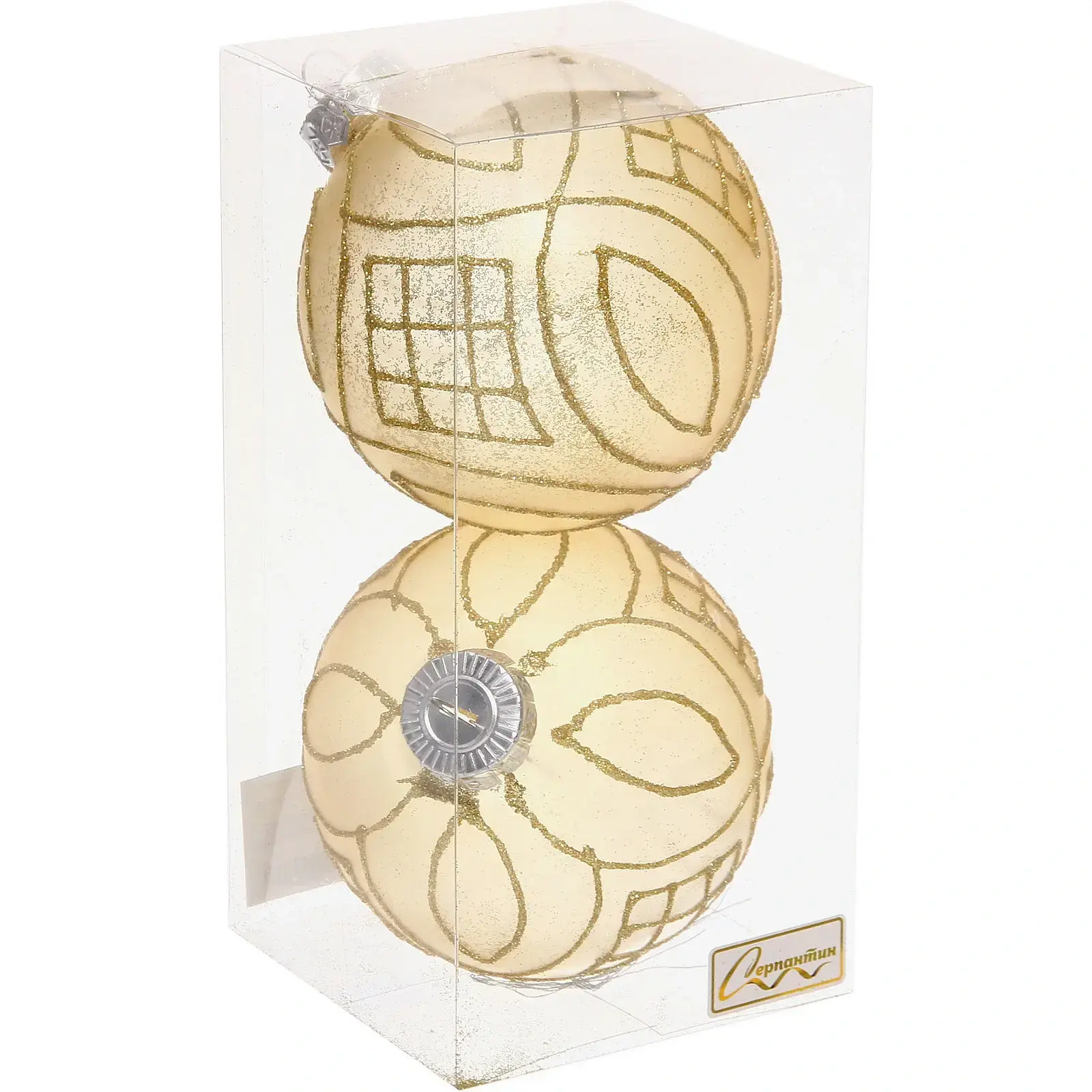 Шары поставляются в удобной прозрачной упаковке, которая защищает их при хранении. Материал: пластик. Цвет: золотой с кремовыми элементами. В комплект входит 2 шара с металлическими креплениями.