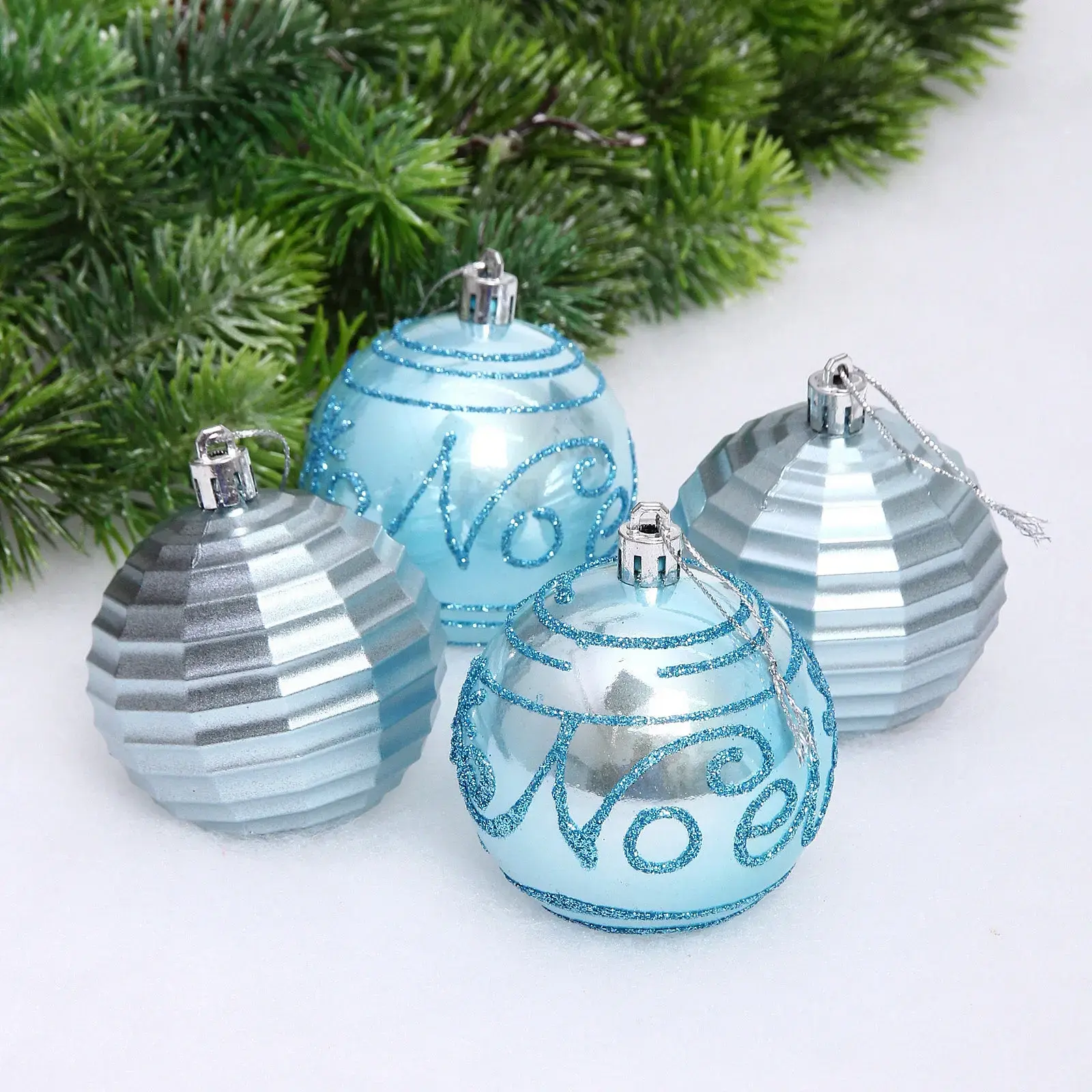Шары поставляются в удобной прозрачной упаковке размером 7см, которая защищает их при хранении. В набор входит: 2 шара с гладкой поверхностью и блестками, 1 шар с надписью "Noel" и 1 шар с рельефной текстурой.
