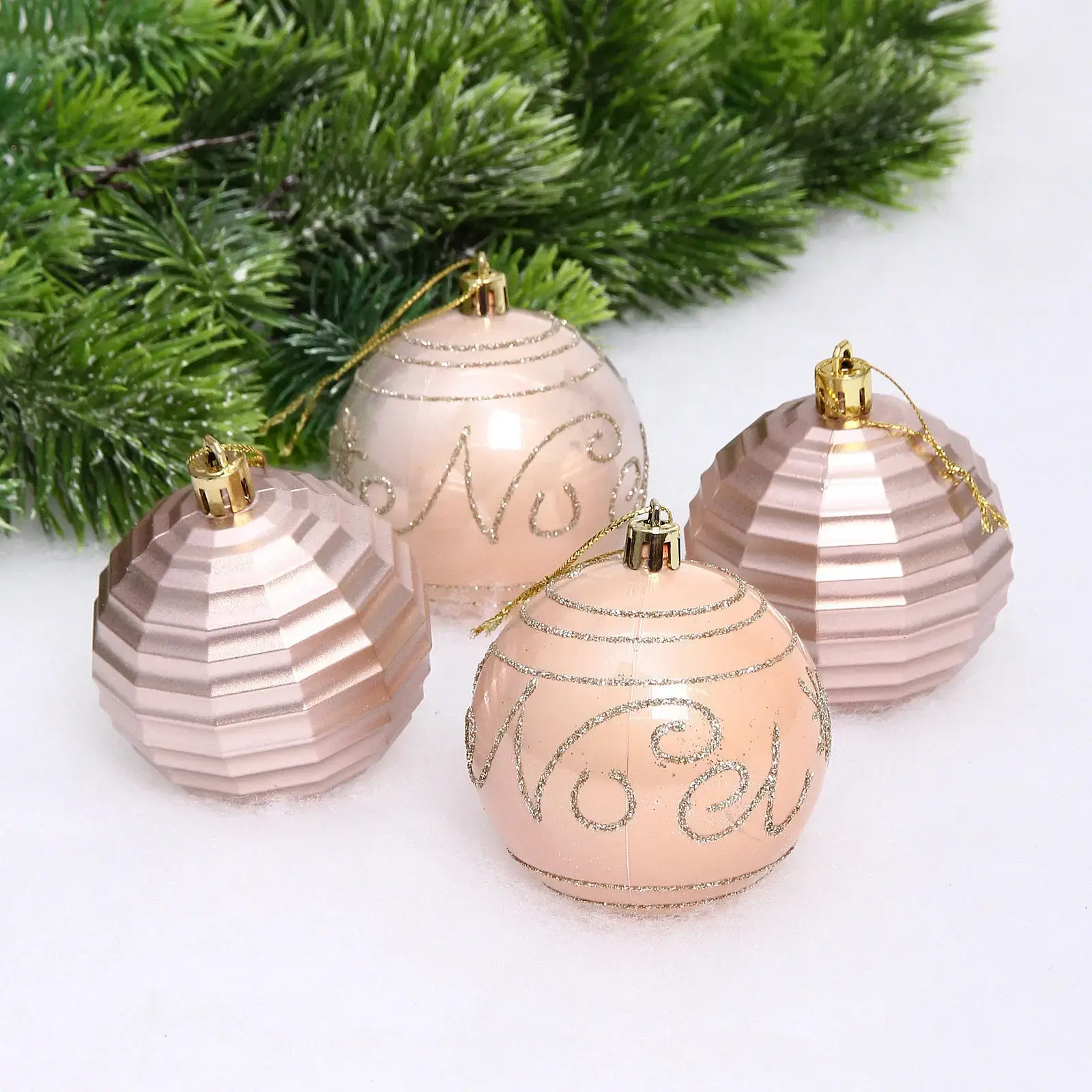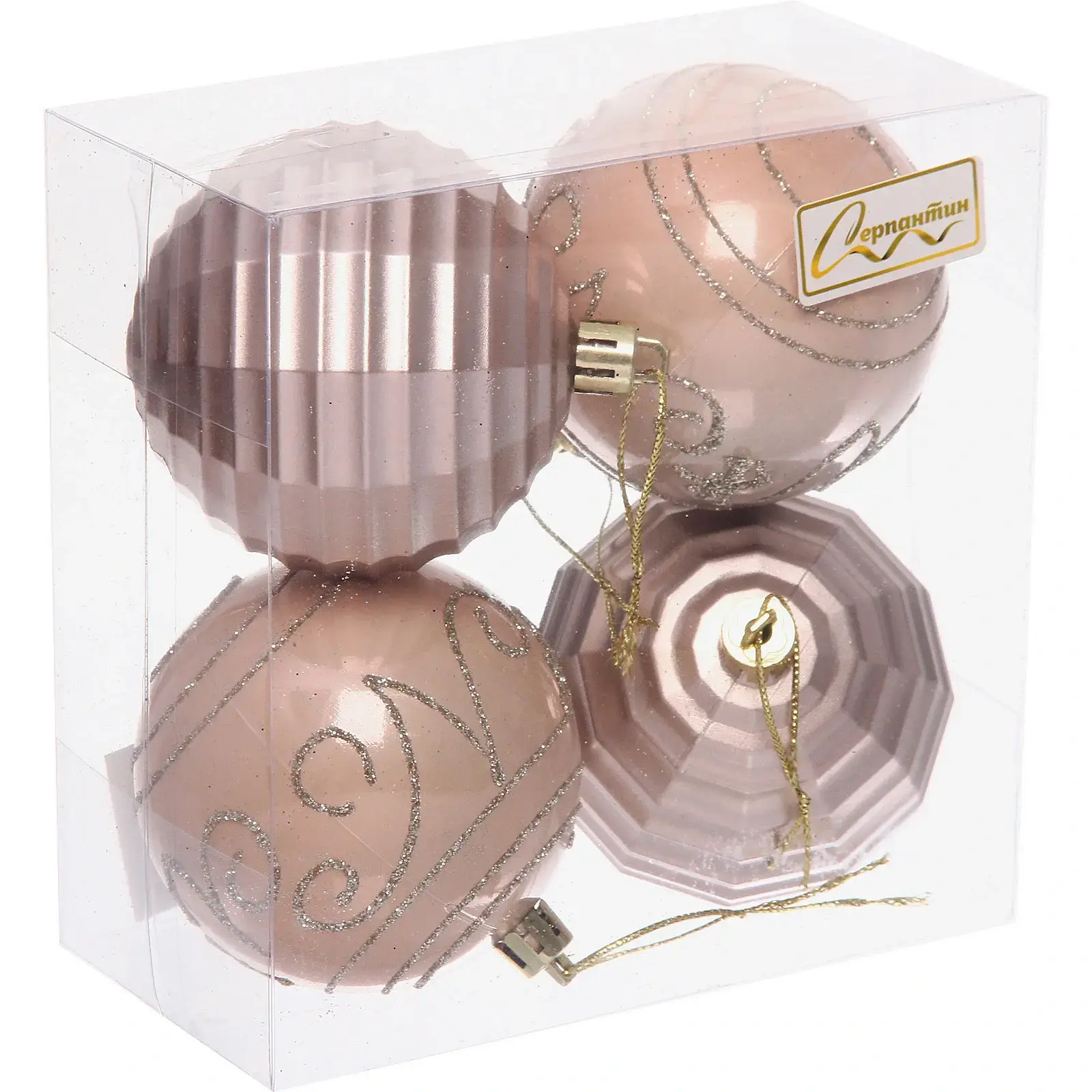 Элегантный набор из четырех новогодних игрушек станет идеальным дополнением вашего праздничного интерьера. Благородные оттенки шампань и розовый с блестящими акцентами создают неповторимое ощущение волшебства.