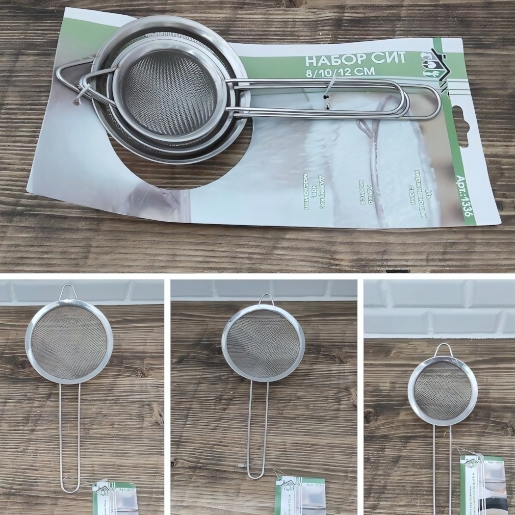 Важно отметить: комплект состоит из трех сит разных размеров, что позволяет подобрать оптимальный вариант для каждого случая. Надежная конструкция изделий исключает деформацию при регулярном использовании.