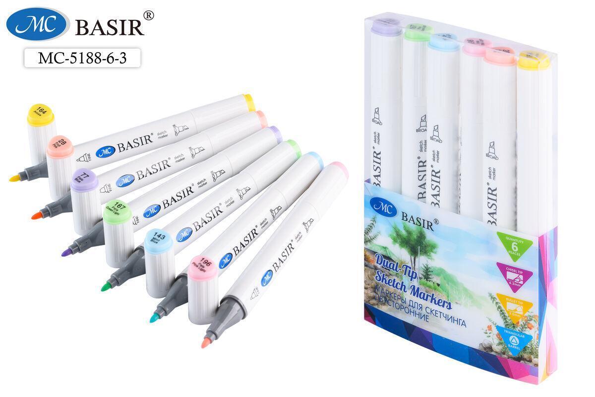 Двусторонние скетчмаркеры Basir, пастельные тона, треугольный корпус, 6 цветов, 1.0-7.0 мм