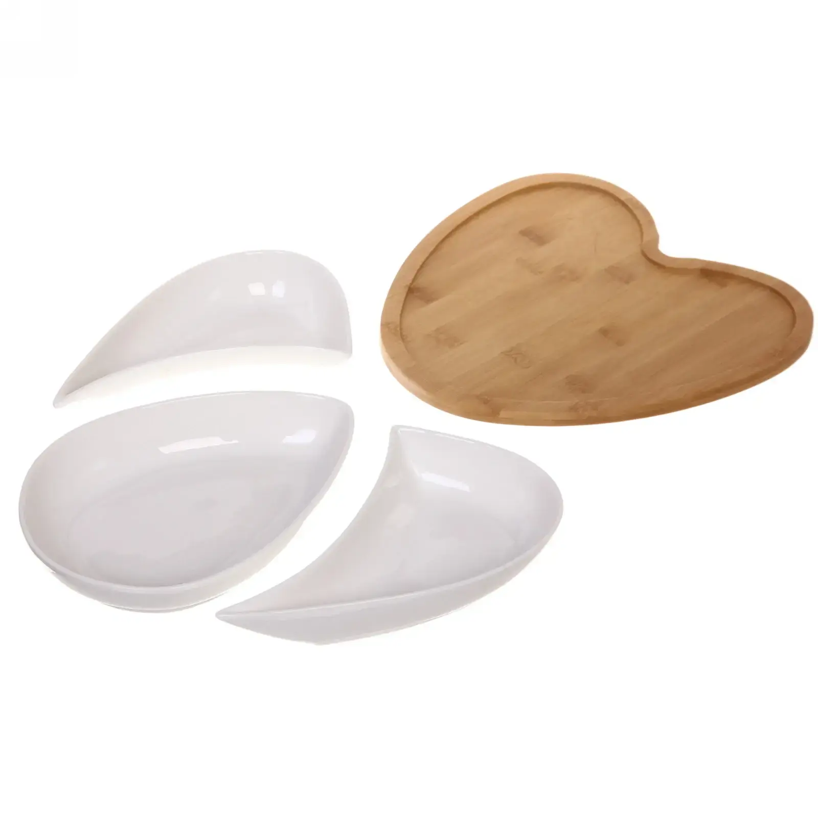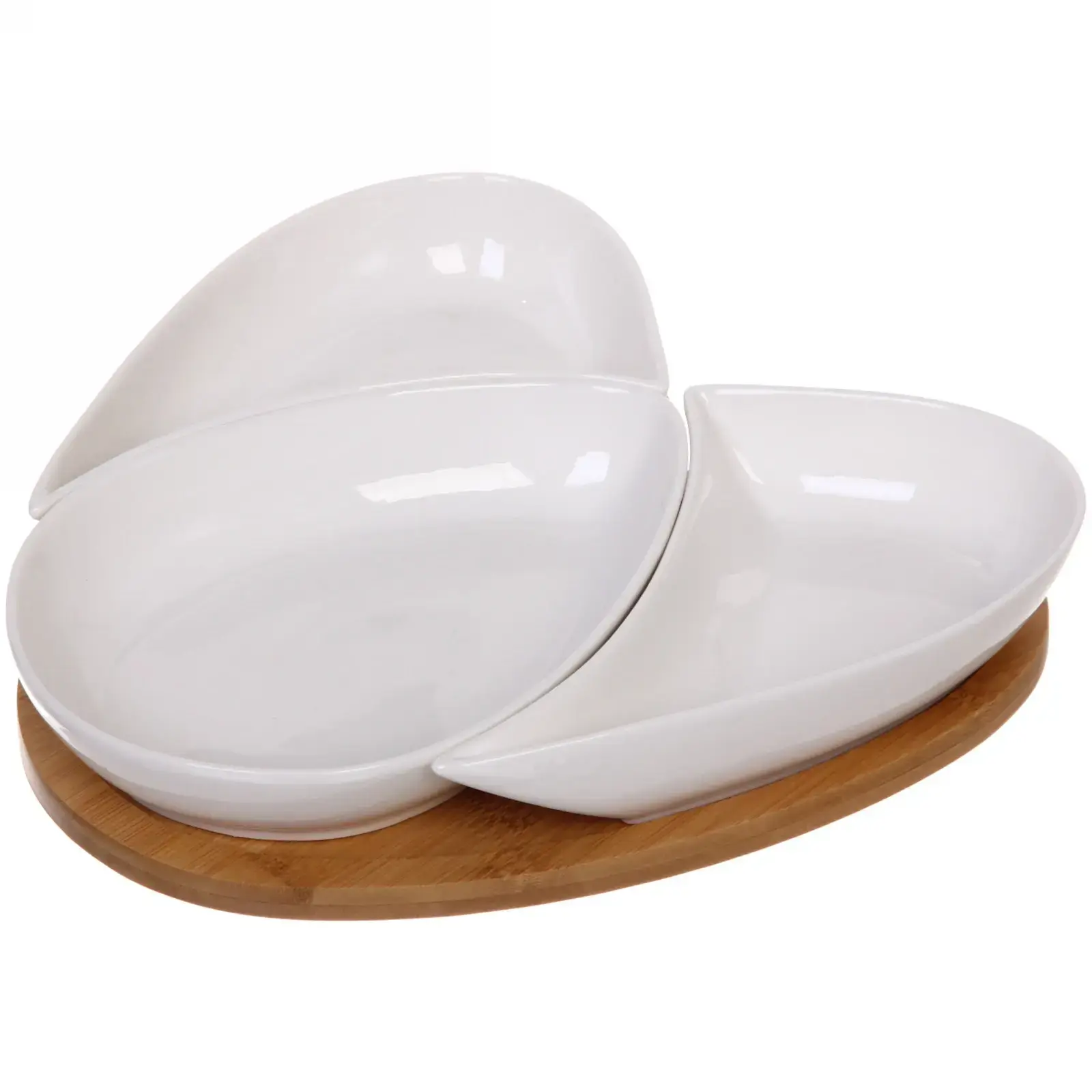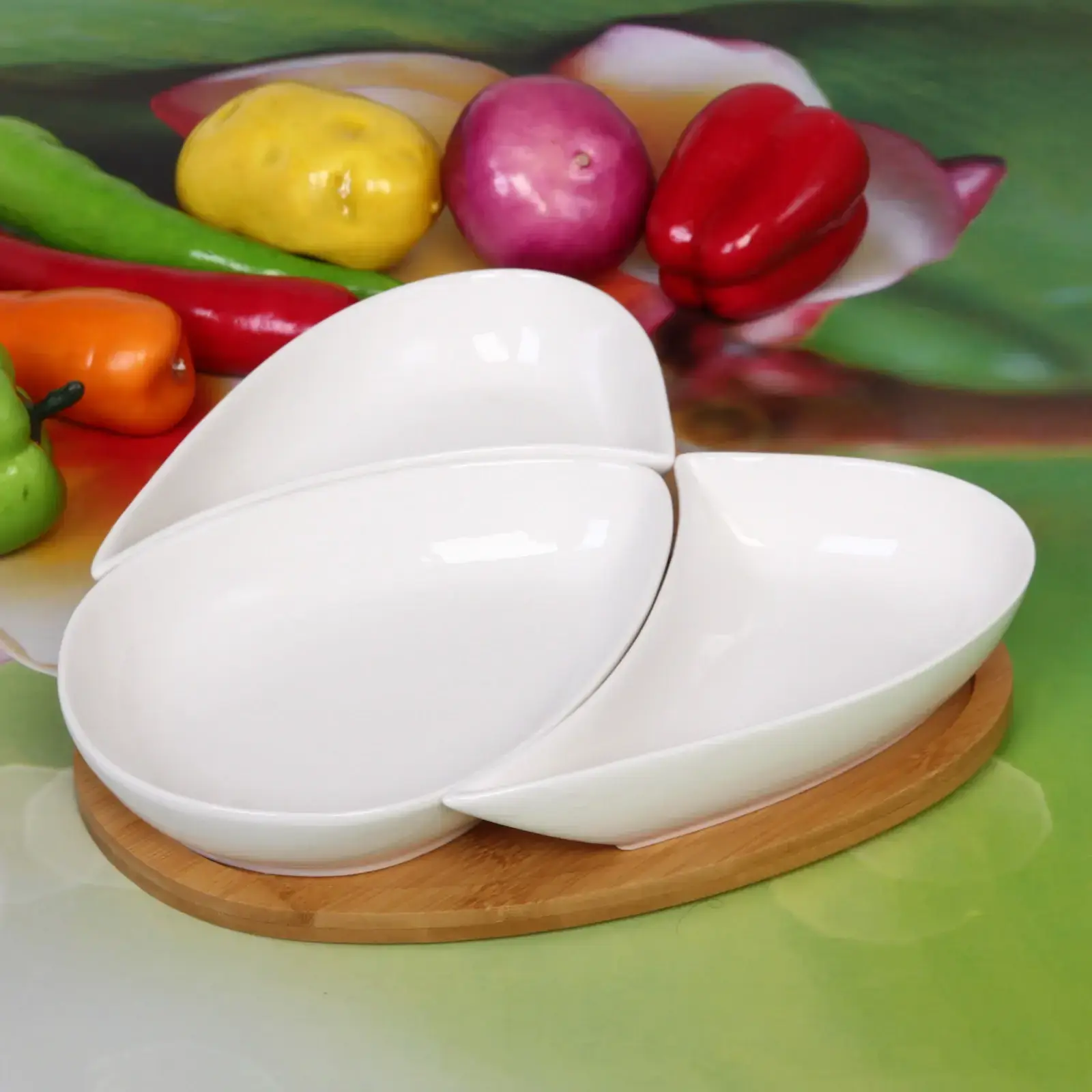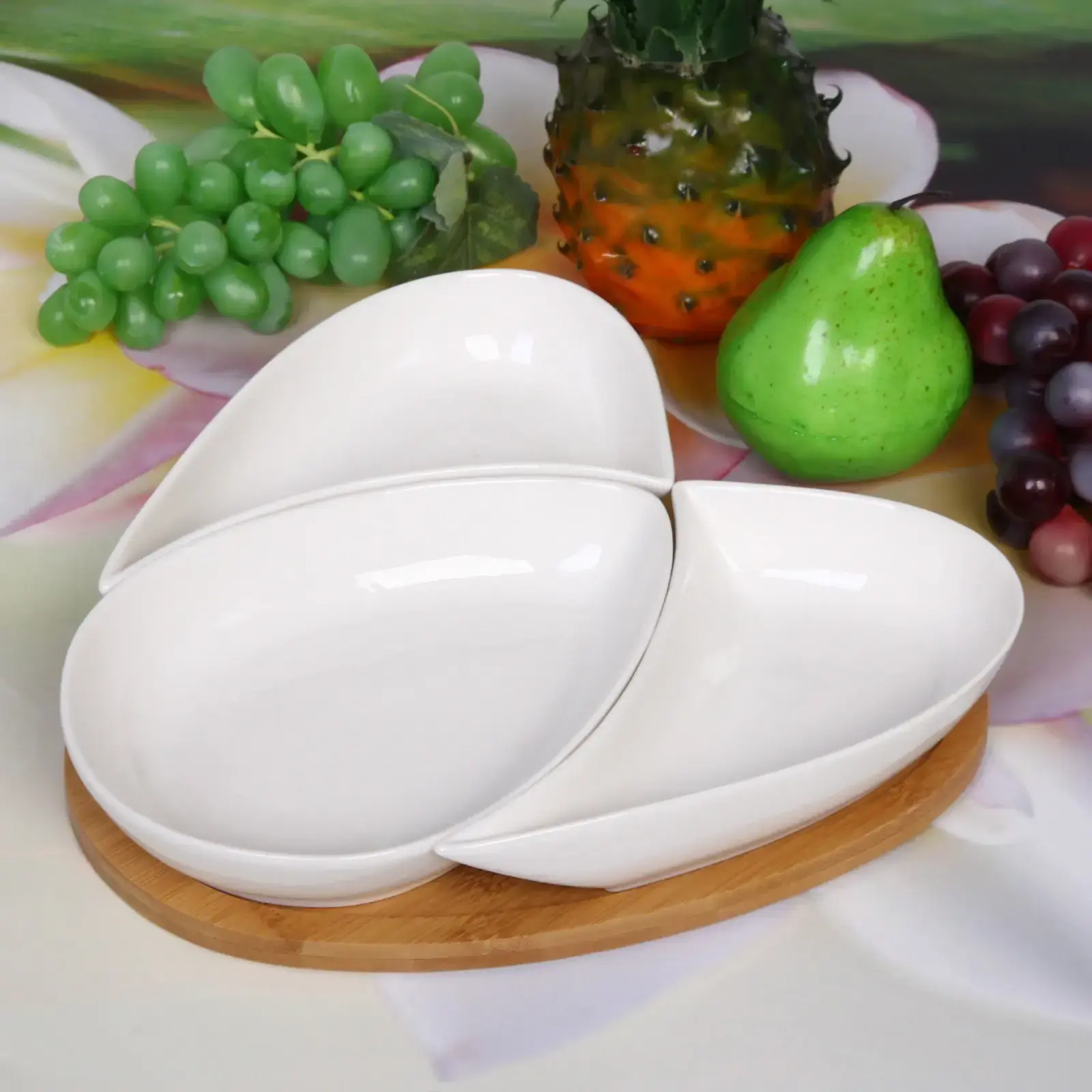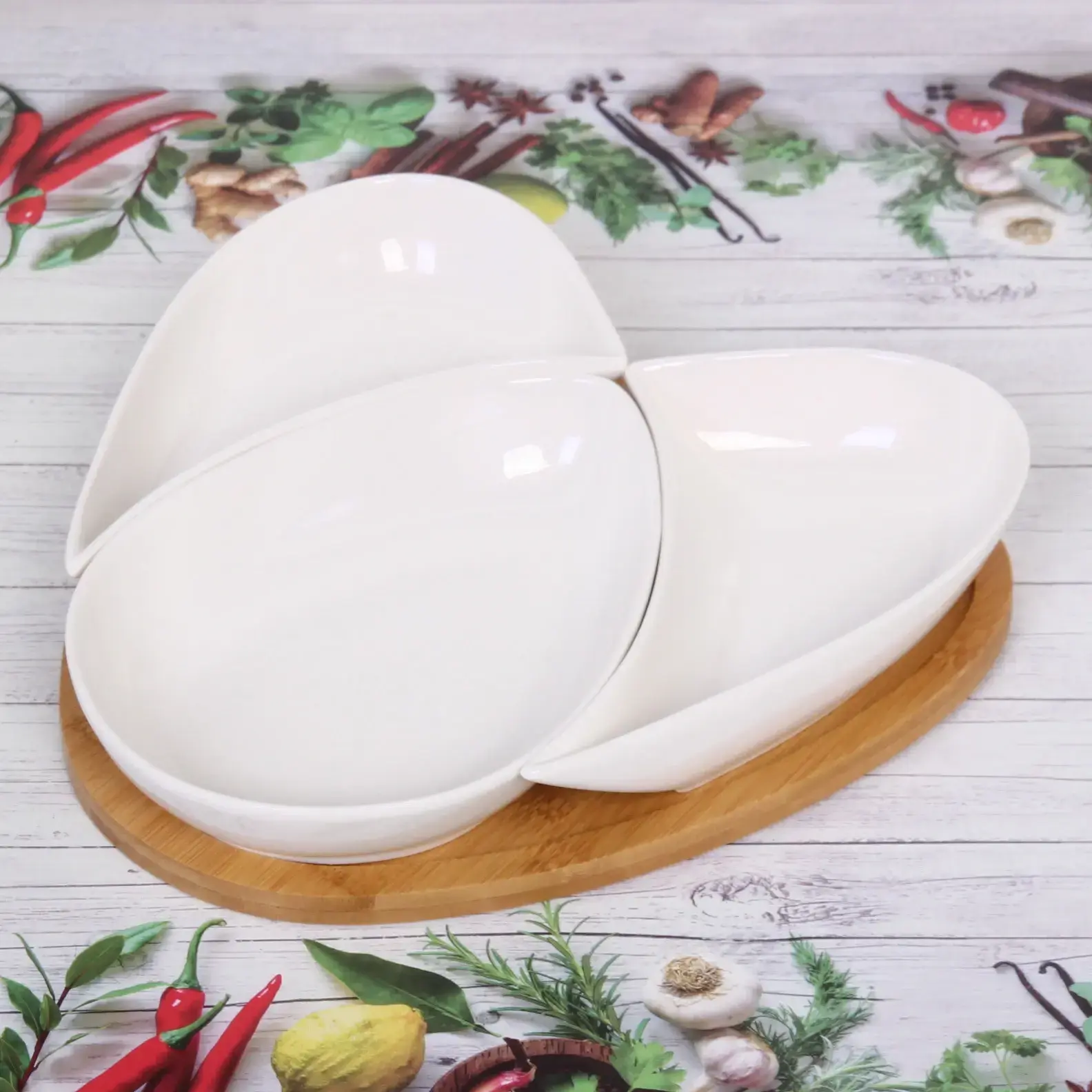 Размеры соусников составляют 25*26 см, что делает их идеальными для подачи различных соусов и закусок. Бамбуковая подставка обеспечивает устойчивость и удобство при сервировке. Набор выполнен в белом цвете, что придаёт ему универсальность и стильный вид.