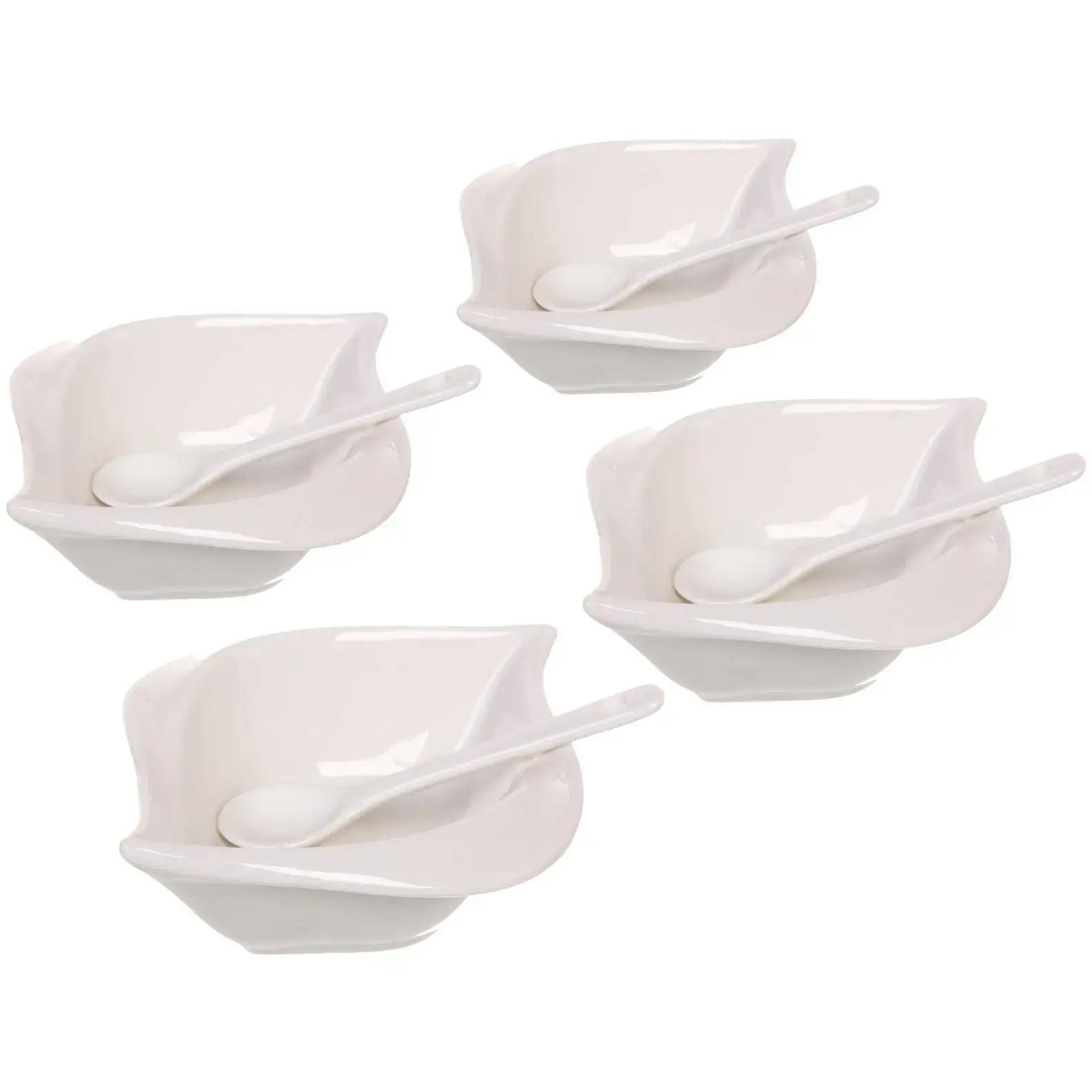 Набор включает 4 соусника объемом 110 мл и ложки, выполненные из керамики. Эти соусники идеально подходят для подачи различных соусов, заправок и закусок. Они легко моются и подходят для использования в посудомоечной машине, что экономит ваше время на уборку после еды.