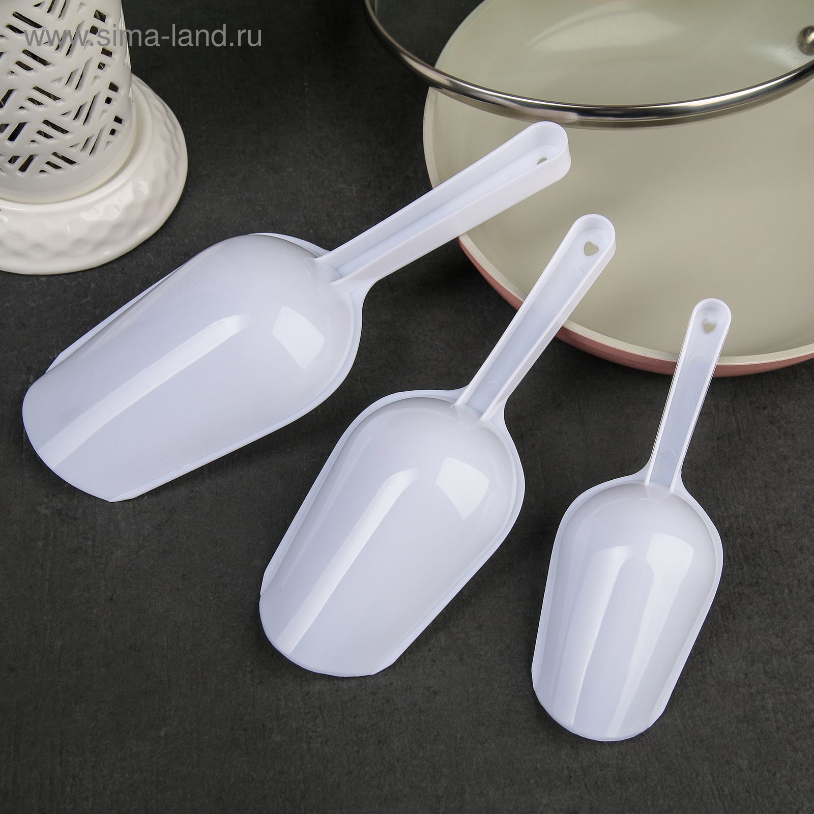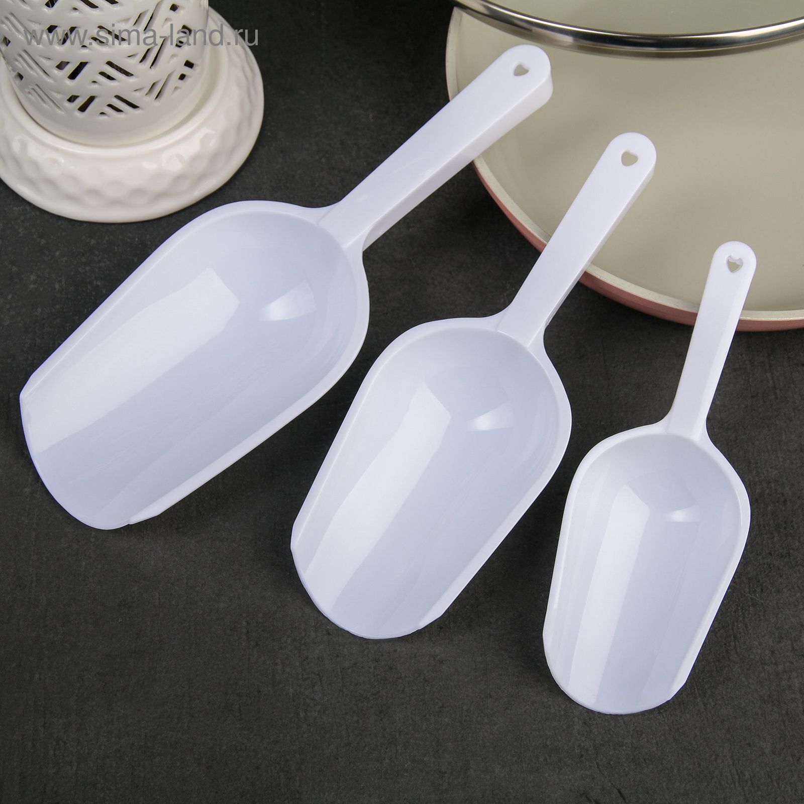 Совки подходят для использования в кулинарии, а также для сервировки. Благодаря своим размерам — 15,5×5,5×2,5 см, 18,7×6,7×3 см и 22,1×8×3,1 см — вы сможете выбрать нужный совок в зависимости от объема ингредиентов. Они идеально подходят для измерения муки, сахара, круп и других сыпучих продуктов.