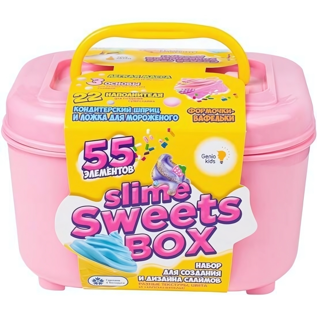 В комплекте: 3 базы для слаймов, универсальный активатор (50 мл), 5 пластилиновых стиков, 4 формочки, набор декоративных элементов (блёстки, пайетки, красители). Все компоненты упакованы в герметичный пластиковый контейнер с крышкой розового цвета (габариты 22×16×8 см). Идеально подходит для детей от 6 лет для самостоятельного творчества или групповых занятий.