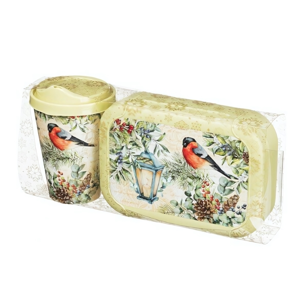 Набор из стакана с крышкой и ланч-бокса станет вашим надежным спутником на работе, пикнике или в дороге. Декоративный дизайн в салатовых тонах с растительными мотивами добавит эстетики вашим моментам.