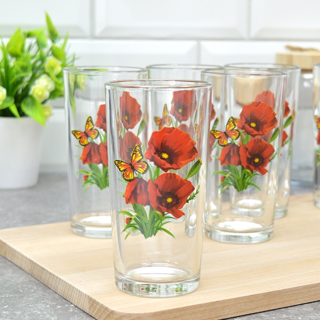 Этот набор из 6 ярких стаканов с эксклюзивным дизайном станет идеальным дополнением вашей посудной коллекции. Каждый стакан украшен красивым рисунком красных маков и бабочек, что создает особую атмосферу уюта за вашим столом.