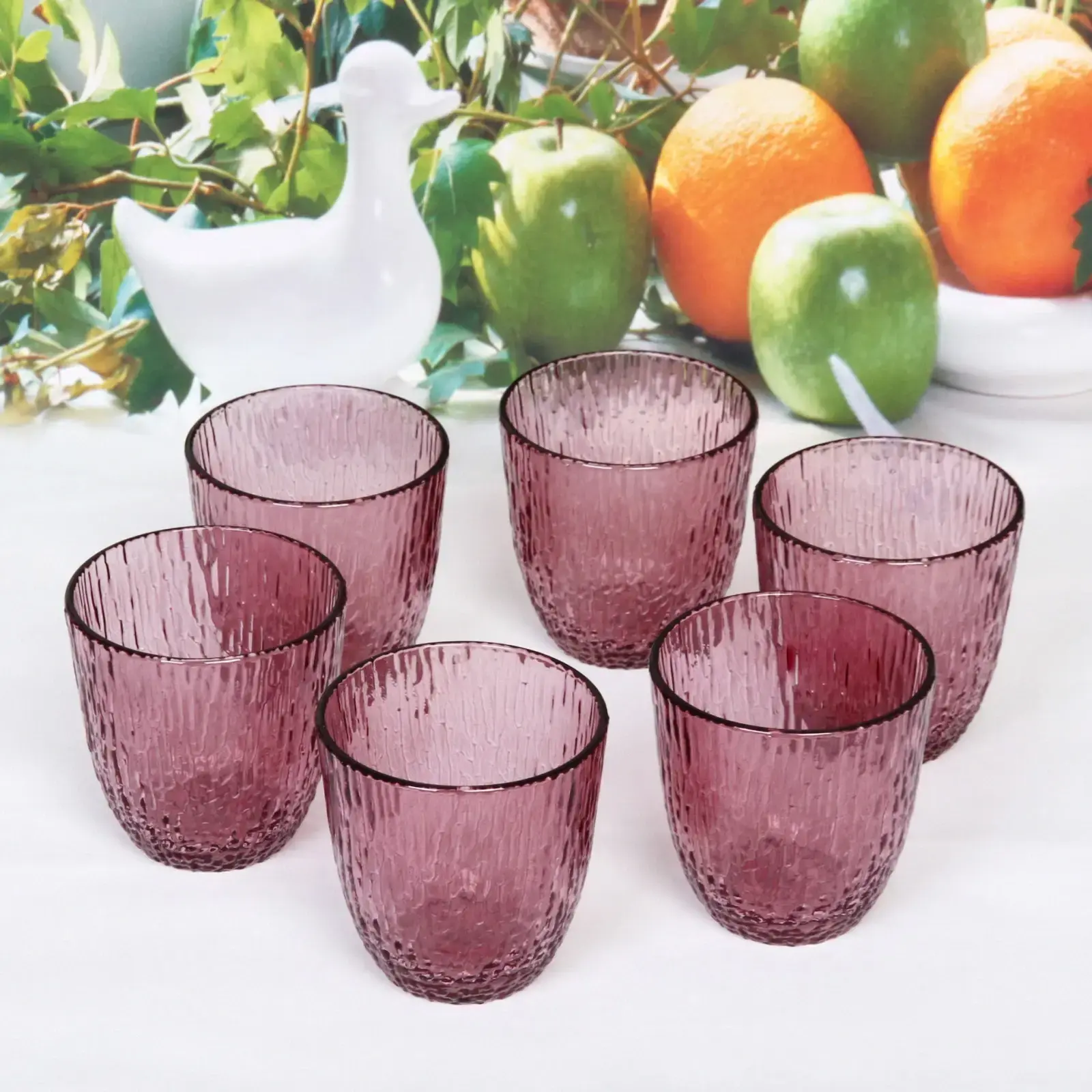 Каждый стакан обладает цилиндрической формой с небольшим сужением к основанию и украшен вертикальной рельефной текстурой, что обеспечивает удобство захвата и эстетичный внешний вид. Размер — около 250-300 мл, что делает их универсальными для ежедневного использования или приёма гостей.