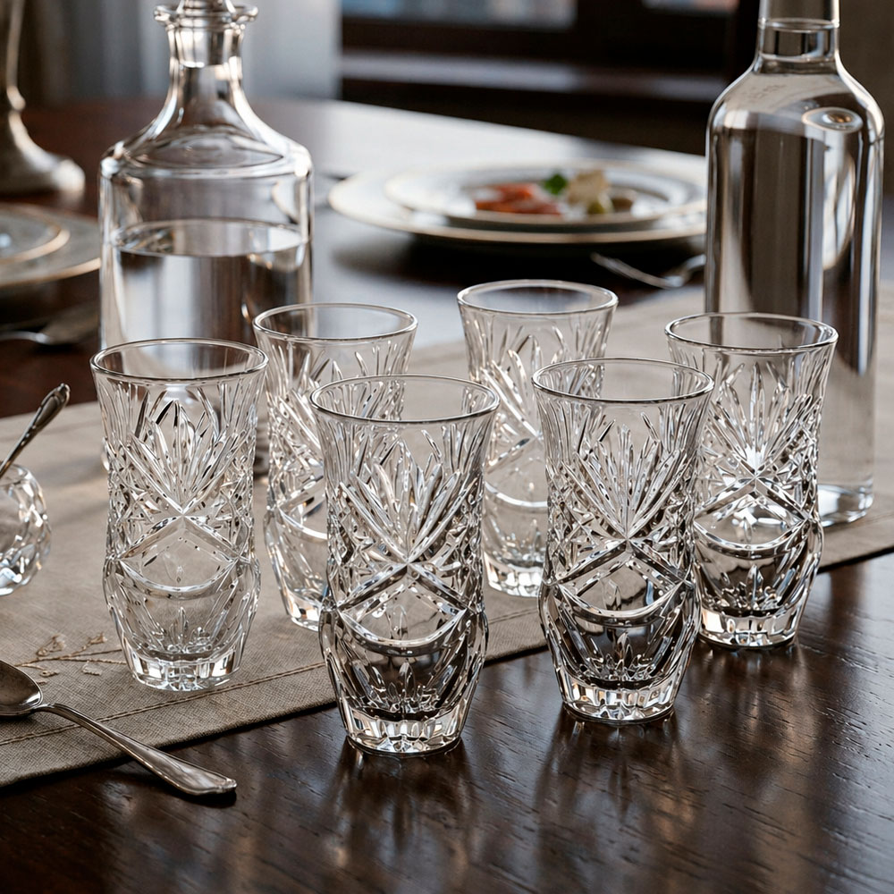 Идеально подходит для домашнего использования и проживания гостей. Стаканы выполнены из стекла, в том числе, вероятно, хрустального, что обеспечивает высокую долговечность и эстетичный внешний вид. Утолщенная нижняя часть гарантирует устойчивость и безопасное использование.