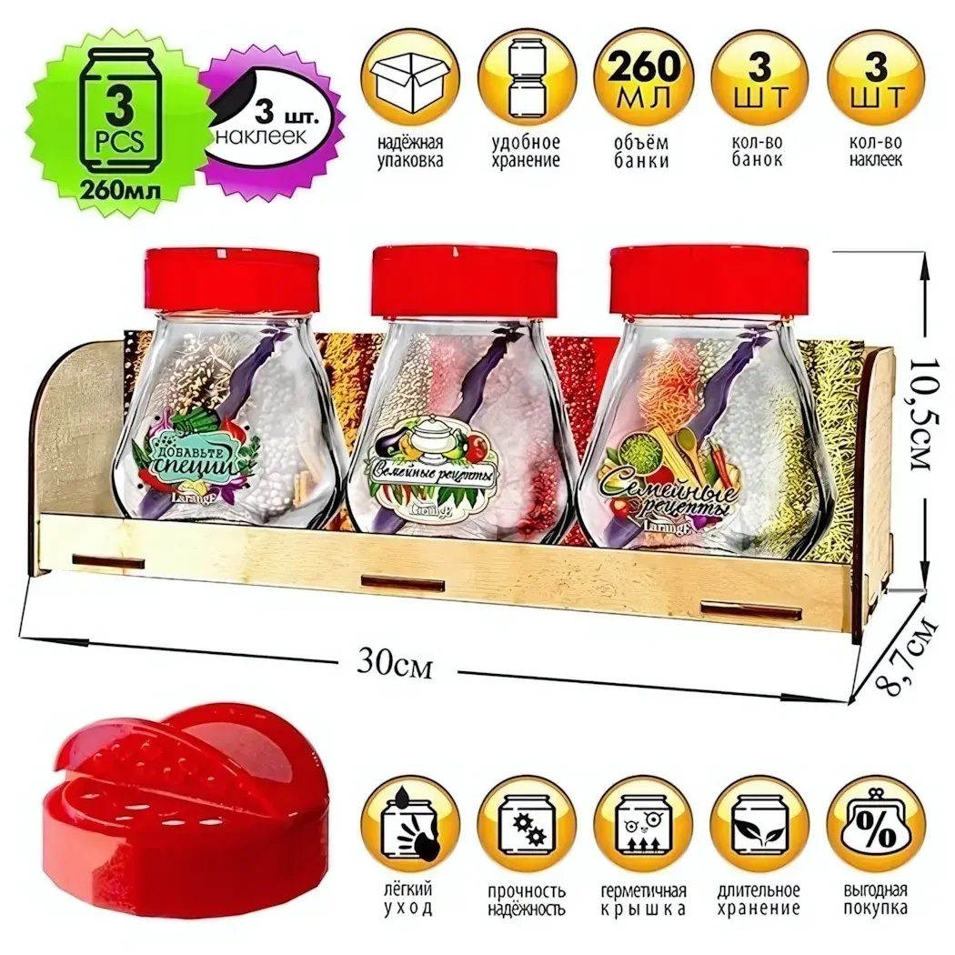 Превратите кухню в организованное пространство с этим практичным набором стеклянных банок. Каждая банка объемом 260 мл оснащена удобной крышкой-дозатором красного цвета, которая делает использование специй комфортным и точным.