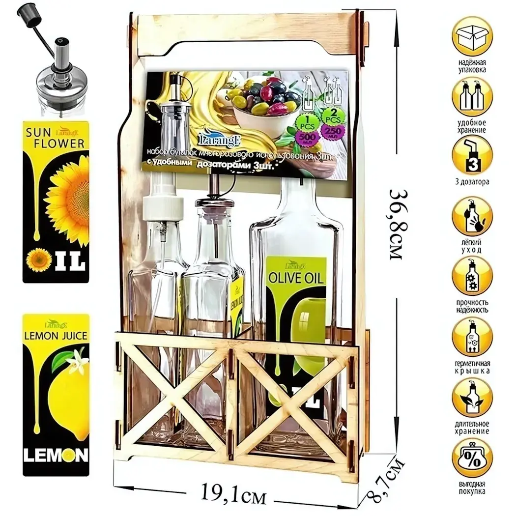Набор состоит из трех ёмкостей, каждая из которых предназначена для определенного продукта: оливкового масла, лимонного сока и подсолнечного масла. Благодаря удобной подставке из дерева, ёмкости всегда будут под рукой и не займут много места на столе. Этот набор станет отличным дополнением для любой кухни, а также прекрасным подарком для любителей кулинарии.