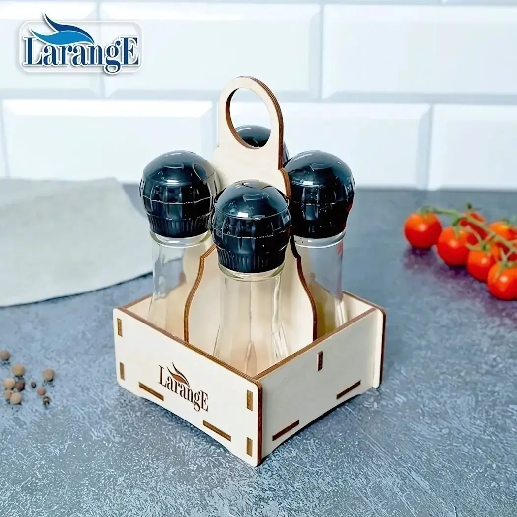Этот набор идеально подходит для любителей кулинарии, которые ценят качество и удобство. Ёмкости удобно размещаются на деревянной подставке, что позволяет экономить место на кухне и поддерживать порядок. Подставка выполнена из светлого дерева и имеет ручку для удобного переноски, что делает её практичным решением для хранения.
