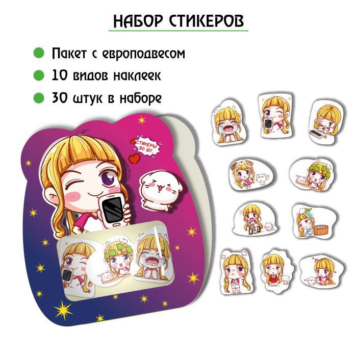 - 30 стикеров — 10 уникальных видов по 3 экземпляра каждого;