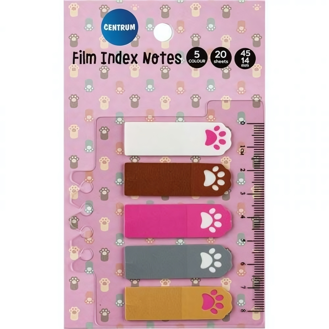 Каждый стикер имеет округлую верхнюю часть, оформленную в виде когтей, что добавляет уникальности. В наборе представлены 5 цветов: белый, коричневый, розовый, серый и желтый. Упаковка с стикерами имеет пластиковую вставку с отверстиями для удобного хранения и подвешивания. Размеры стикеров идеально подходят для использования в любых блокнотах и планировщиках.