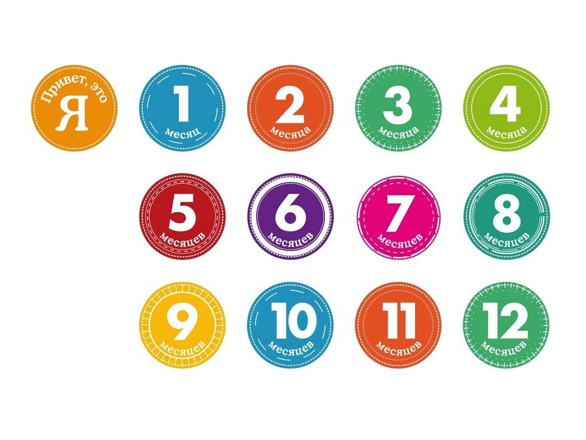 Круглые стикеры диаметром около 8 см выполнены из гипоаллергенного винила. Каждая наклейка имеет двойной контур: внутренний круг с цифрой месяца и внешнее цветное кольцо. Контрастная белая подложка обеспечивает четкую читаемость надписей даже на ярком фоне.