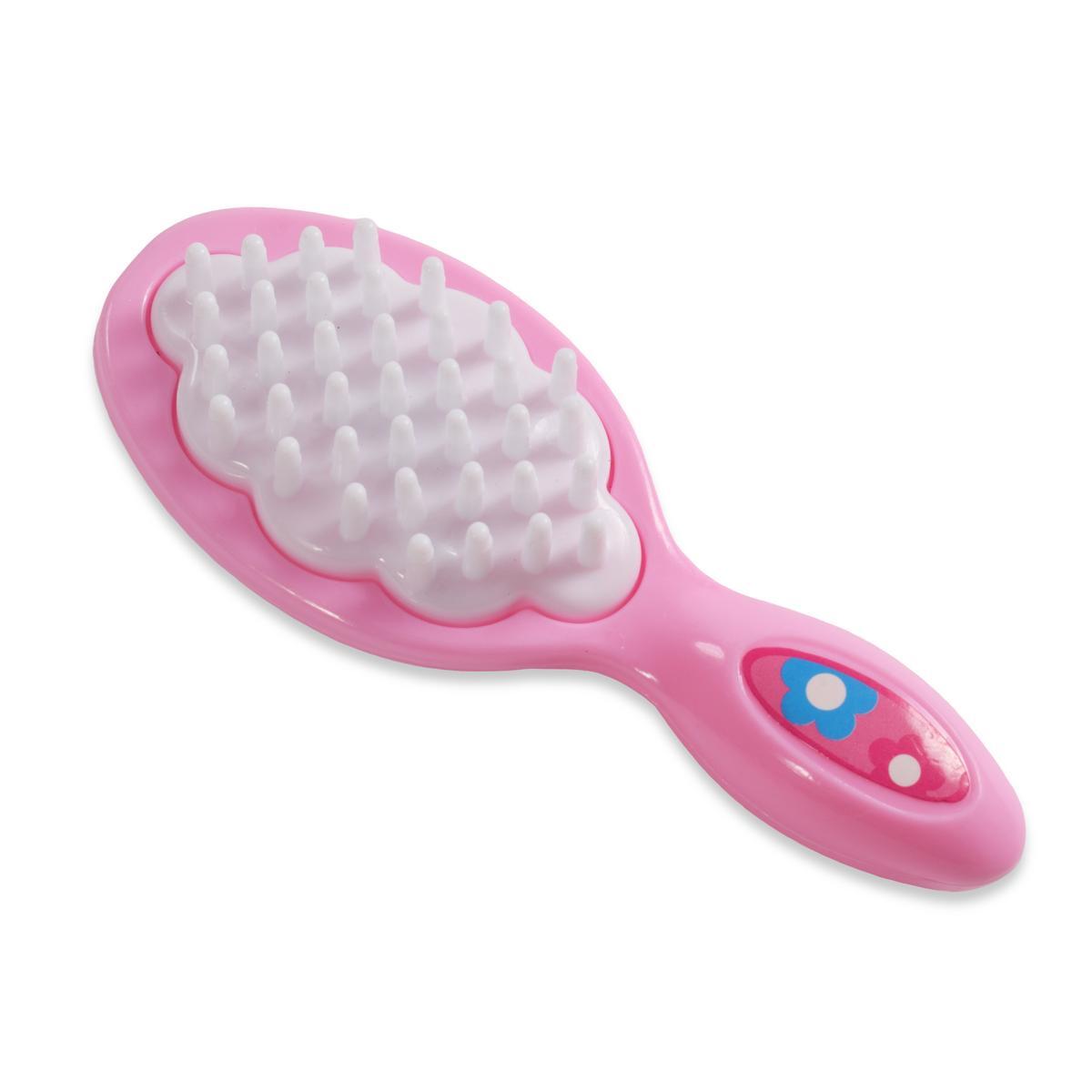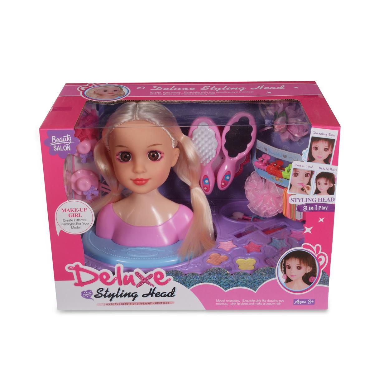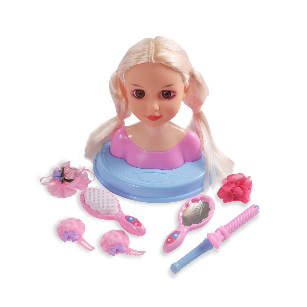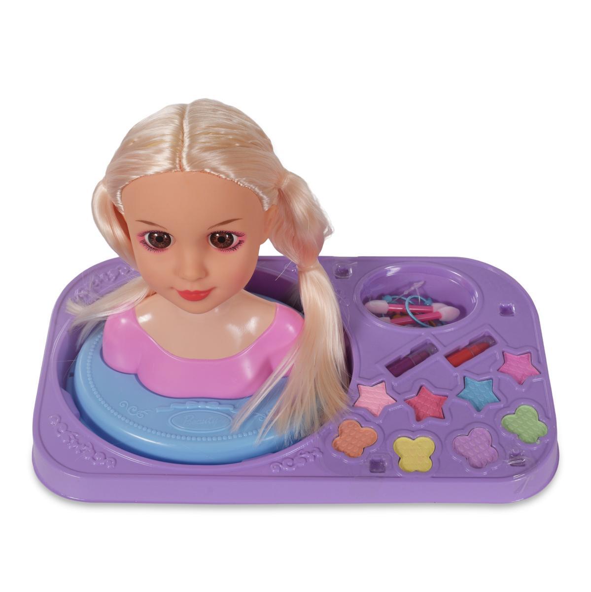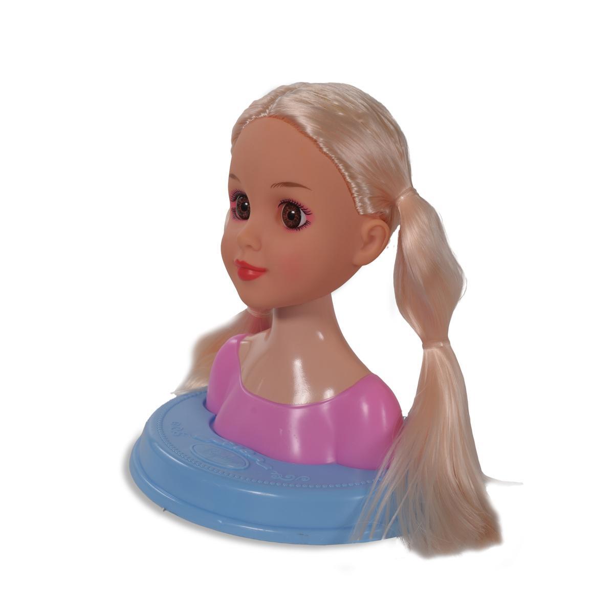 Набор включает в себя манекен с реалистичными чертами лица и длинными светлыми волосами, а также множество аксессуаров для укладки. В комплект входят две расчески, зеркало, три розовые завязки с бантиками и повязка на голову в форме цветка. С помощью этих инструментов девочка сможет экспериментировать с различными стилями и укладками, развивая свои навыки и фантазию.