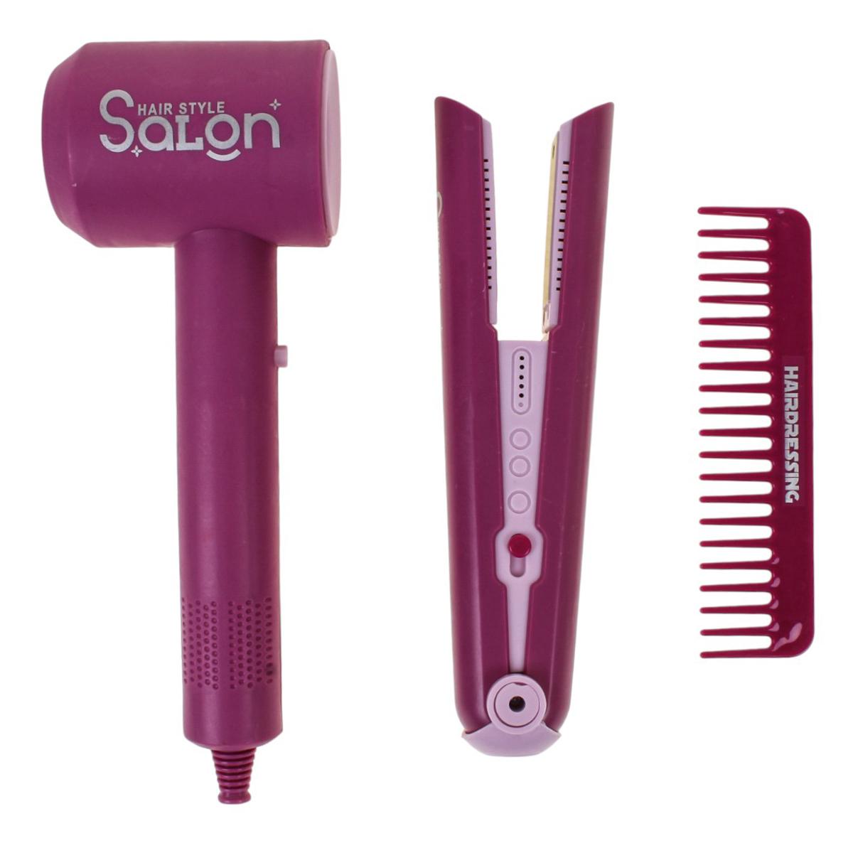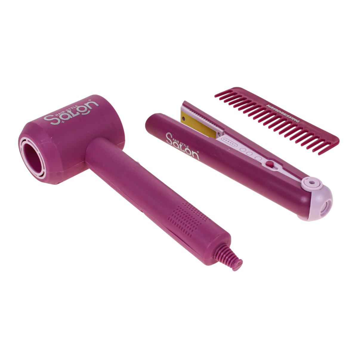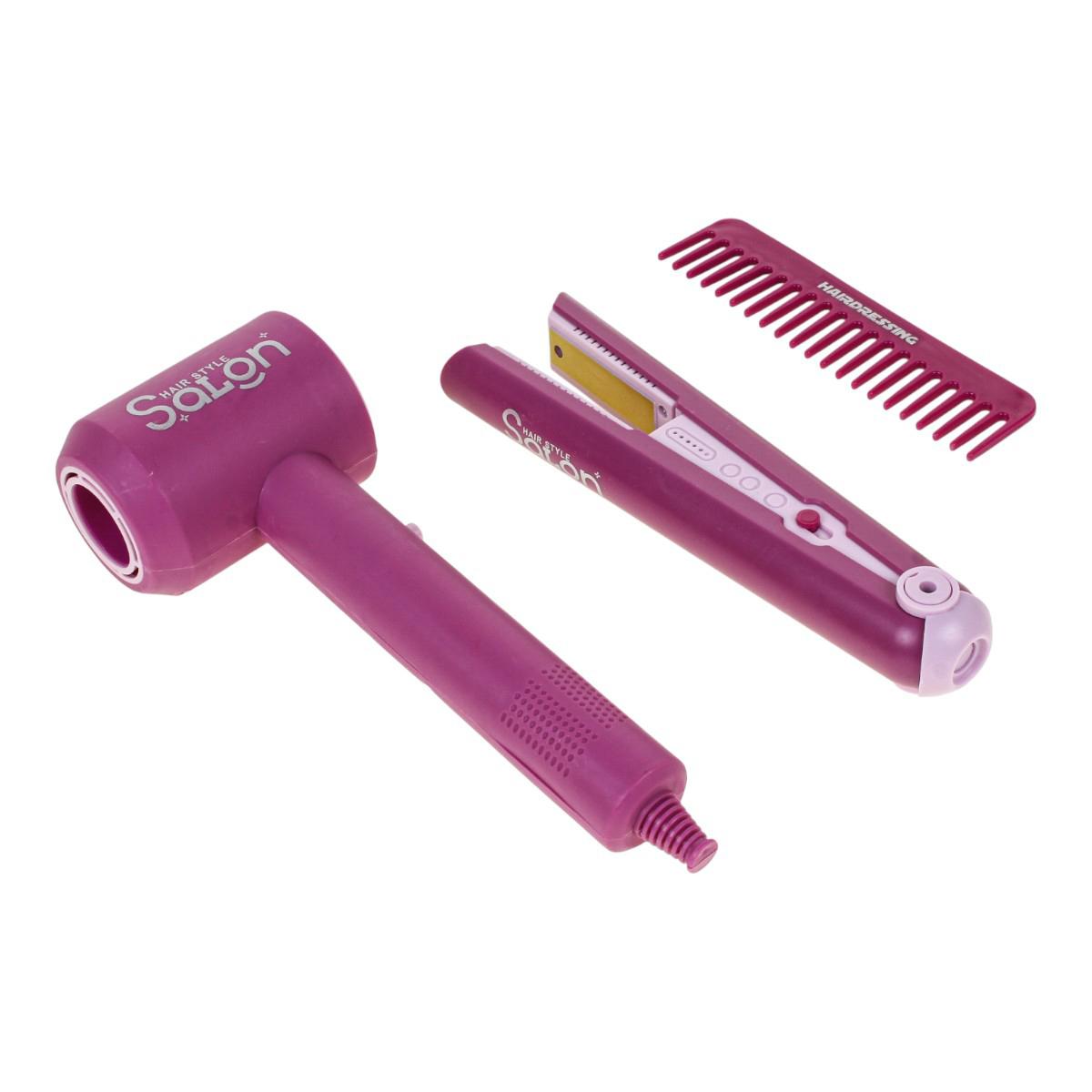 - Игрушечный фен розово-фиолетового цвета с надписью «HAIR STYLE Salon». Имеет удобную ручку и реалистичный дизайн.