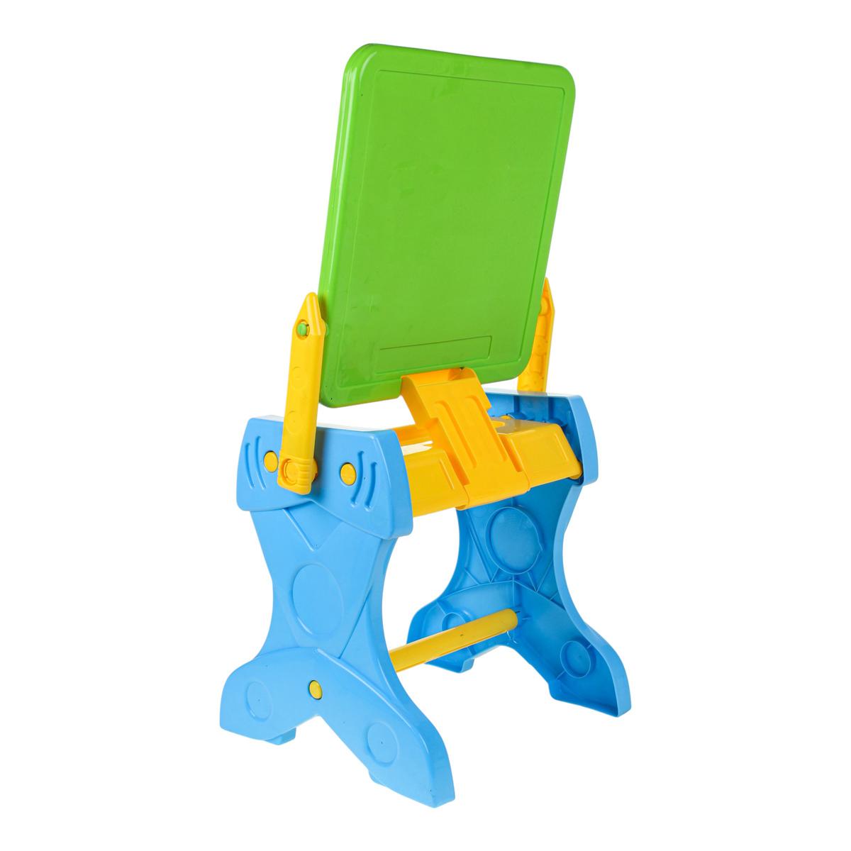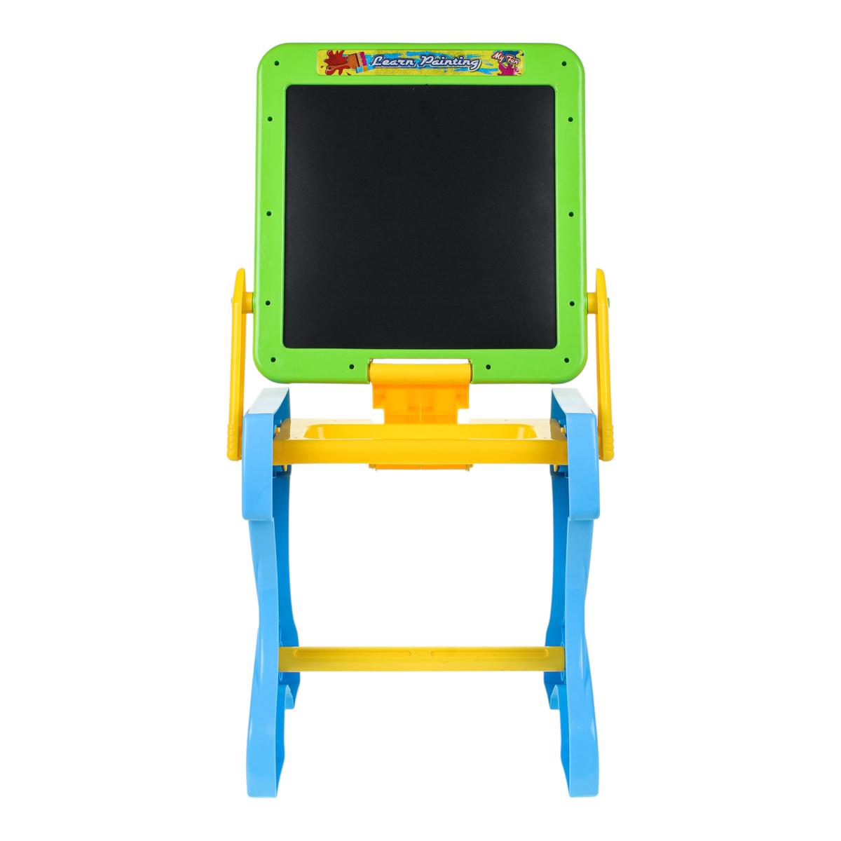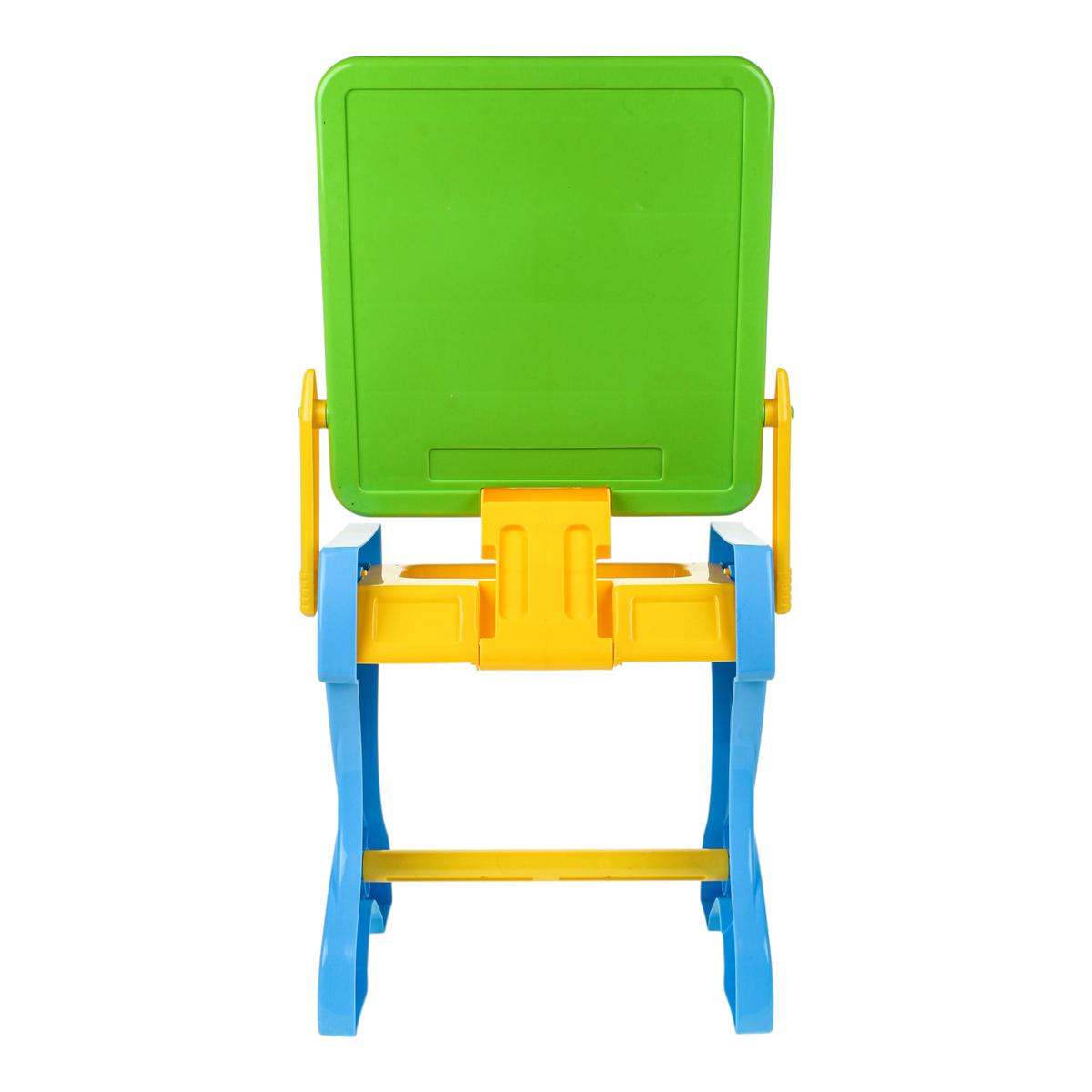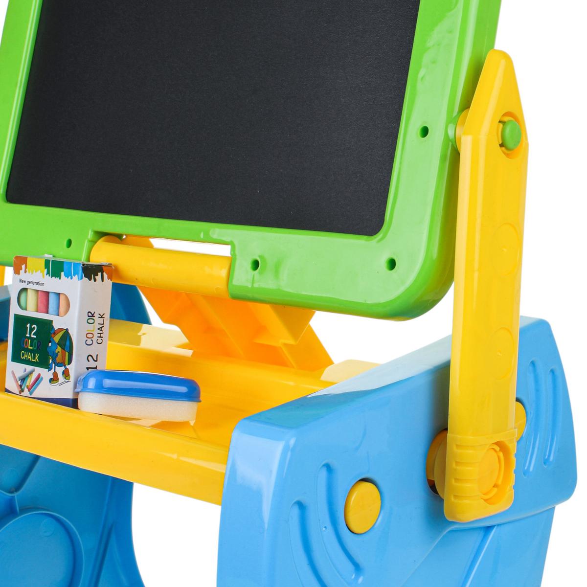 Изделие выполнено из прочного пластика в ярком сочетании синего, салатового и желтого цветов. Под доской предусмотрена удобная полка для хранения мелков и аксессуаров. Размер конструкции в собранном виде составляет 75x40x37 см — оптимально для детей от 3 лет. Компактный формат позволяет разместить стол-мольберт даже в небольшой комнате.
