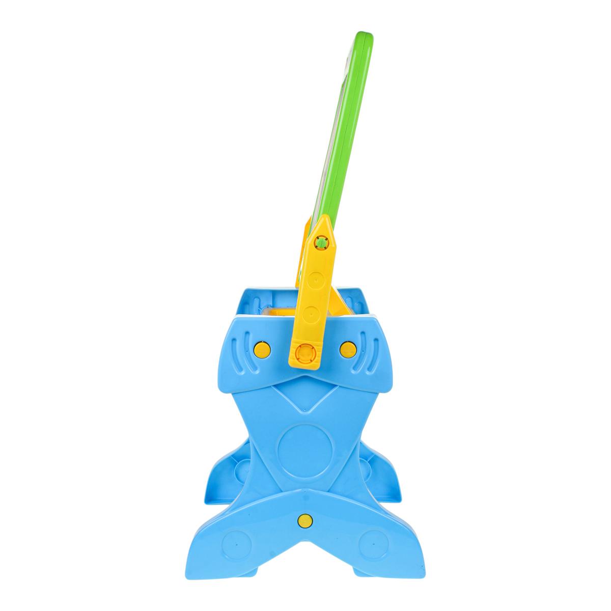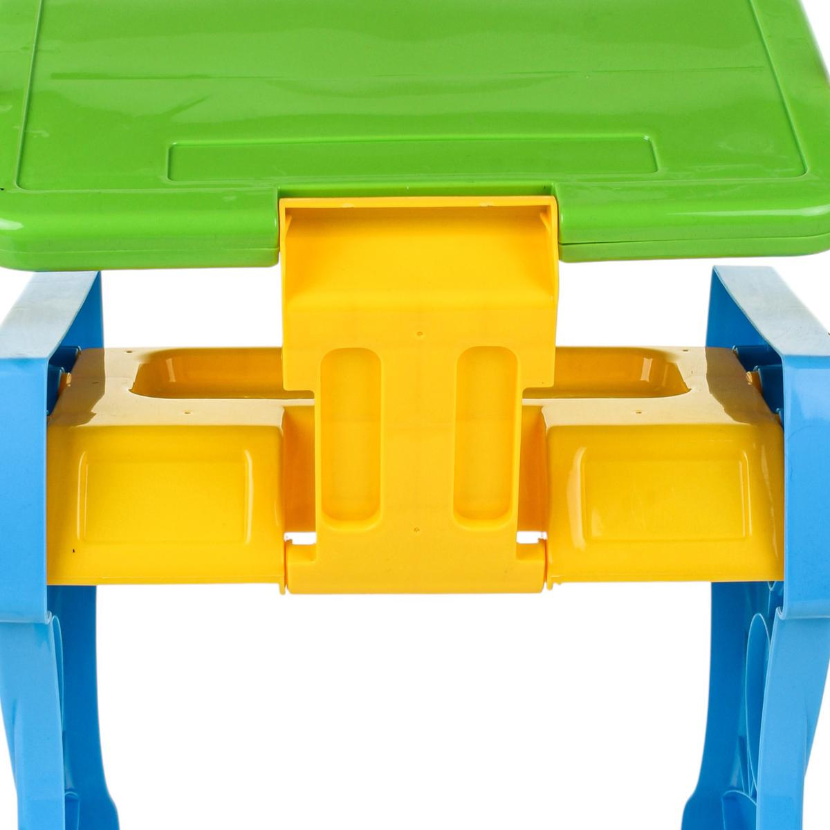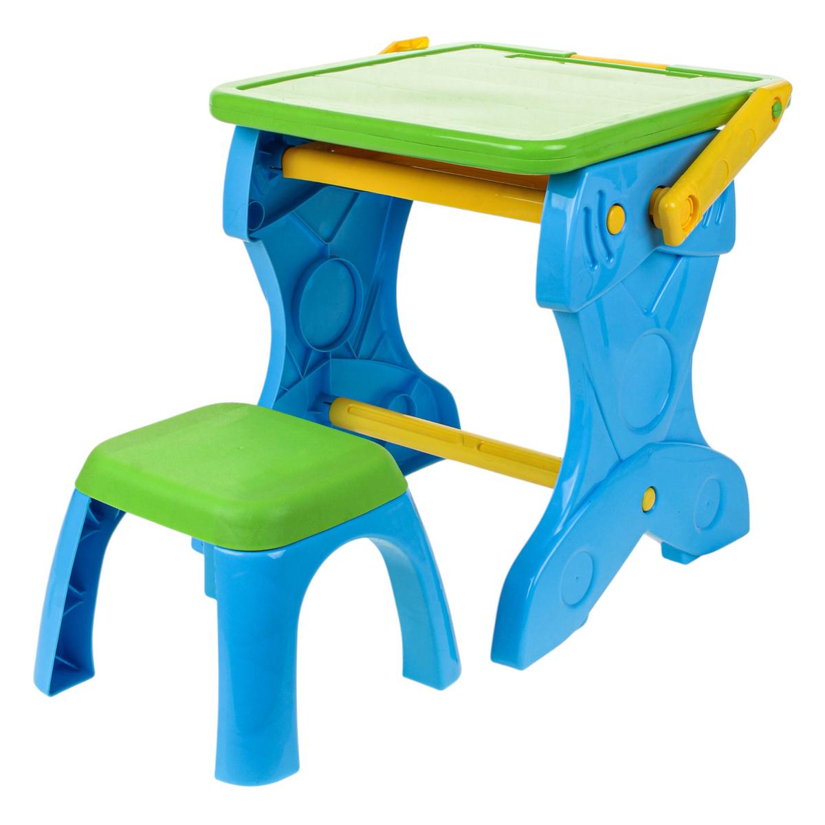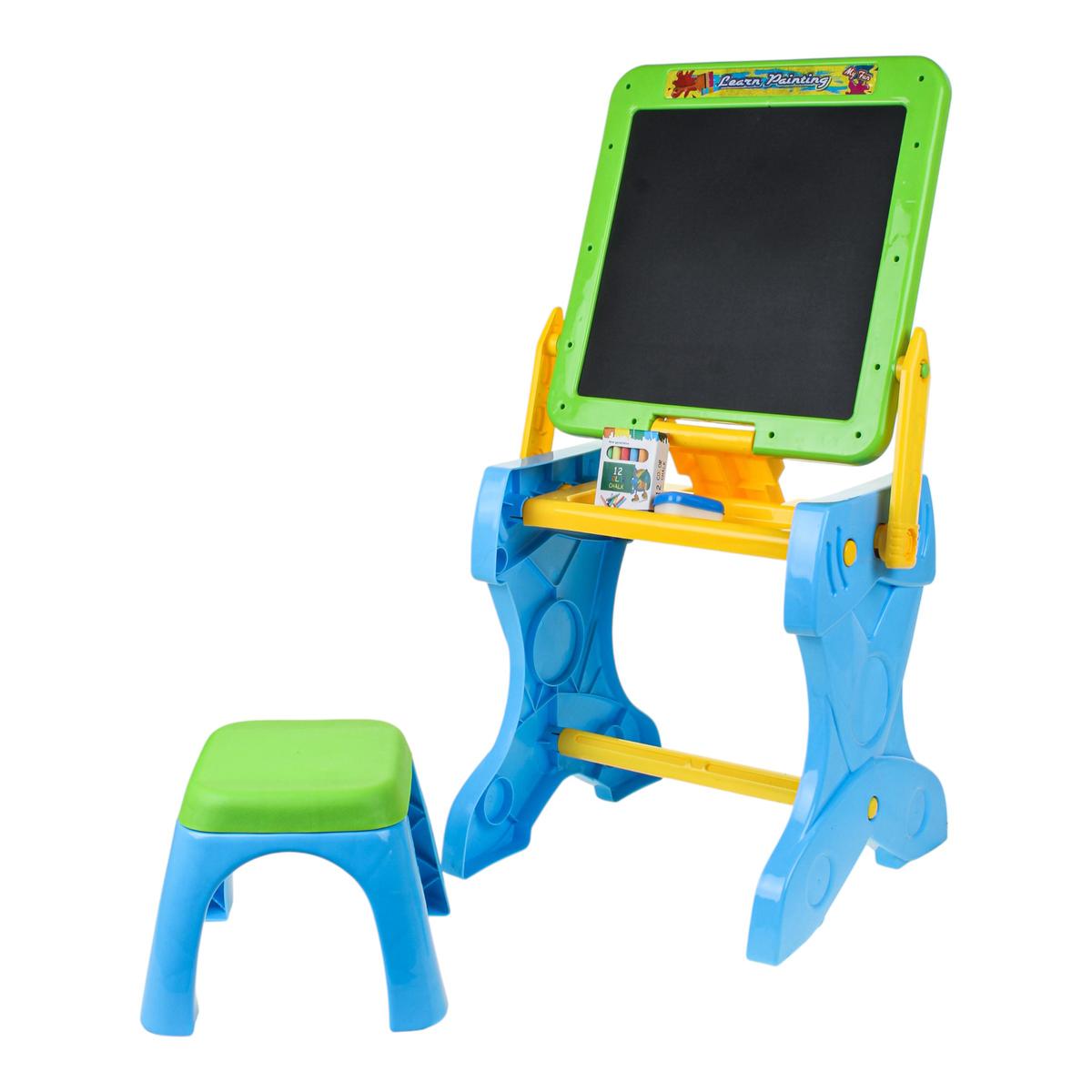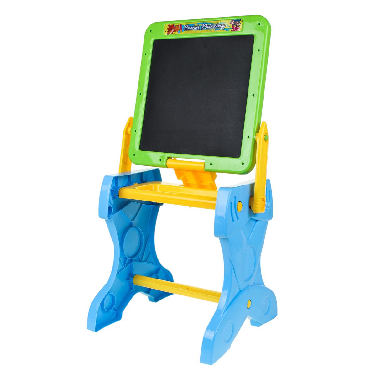 Изделие выполнено из прочного пластика в ярком сочетании синего, салатового и желтого цветов. Под доской предусмотрена удобная полка для хранения мелков и аксессуаров. Размер конструкции в собранном виде составляет 75x40x37 см — оптимально для детей от 3 лет. Компактный формат позволяет разместить стол-мольберт даже в небольшой комнате.
