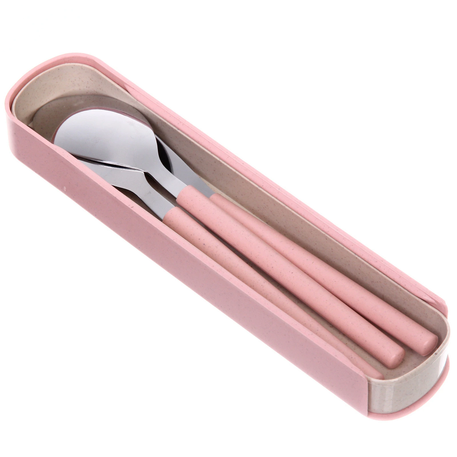 Рабочие части приборов выполнены из нержавеющей стали с гладкой поверхностью, что обеспечивает долговечность и простоту ухода. Ручки изготовлены из пластика, комфортно лежат в руке и устойчивы к повседневному использованию. Футляр надежно закрывается и защищает содержимое от загрязнений. Розовый оттенок придает набору аккуратный и современный внешний вид, благодаря чему он гармонично смотрится как дома, так и вне его.