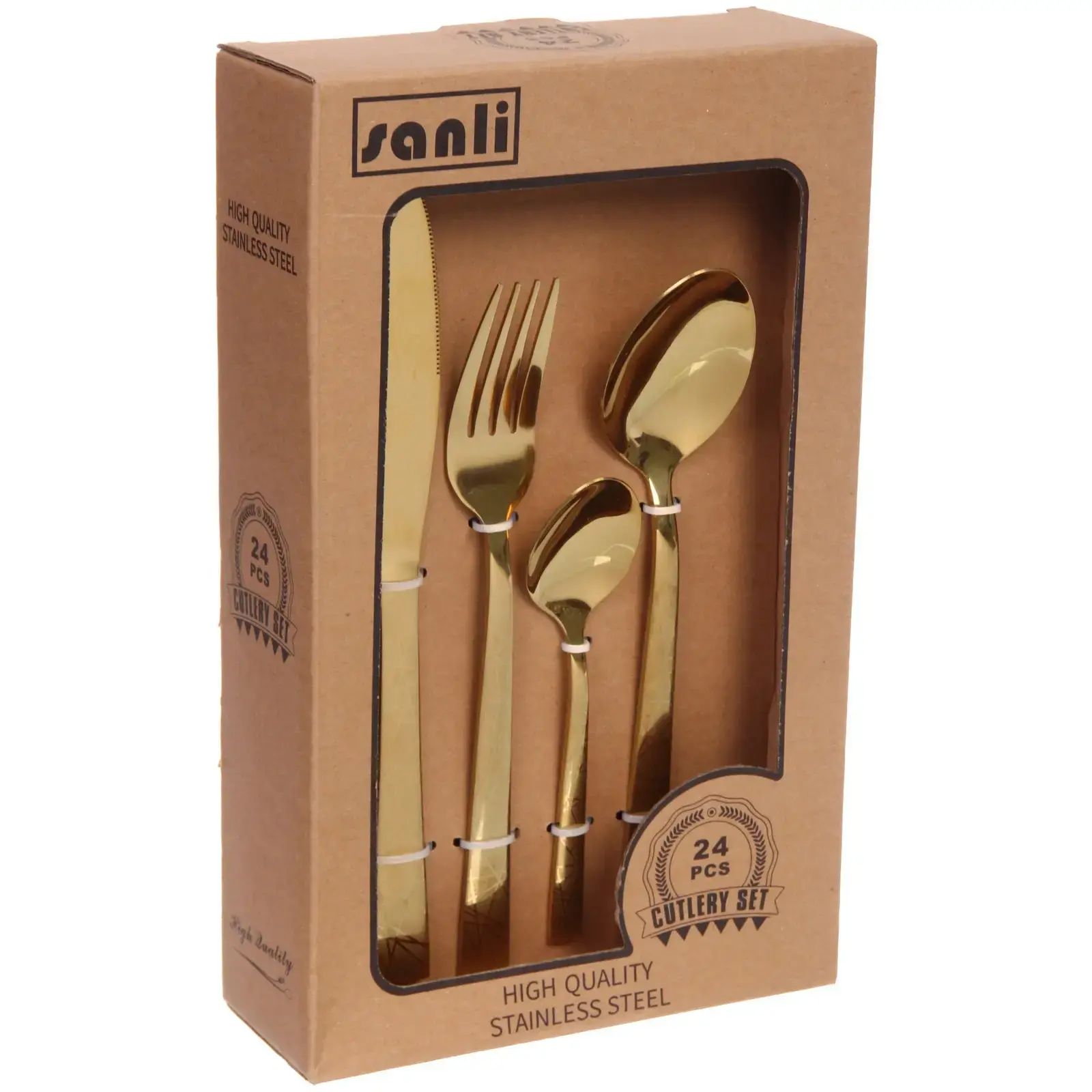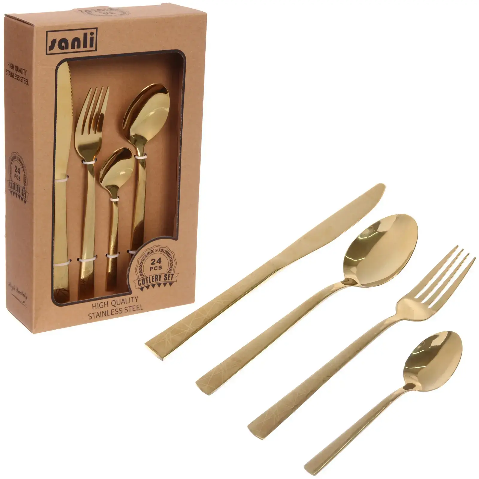 Погрузитесь в атмосферу утонченности и стиля с набором столовых приборов «SANLI». Этот набор из 24 предметов, выполненный из высококачественной нержавеющей стали с золотистым покрытием, станет идеальным дополнением к вашему столу. Приборы не только красивы, но и практичны, что делает их отличным выбором для повседневного использования и особых случаев.